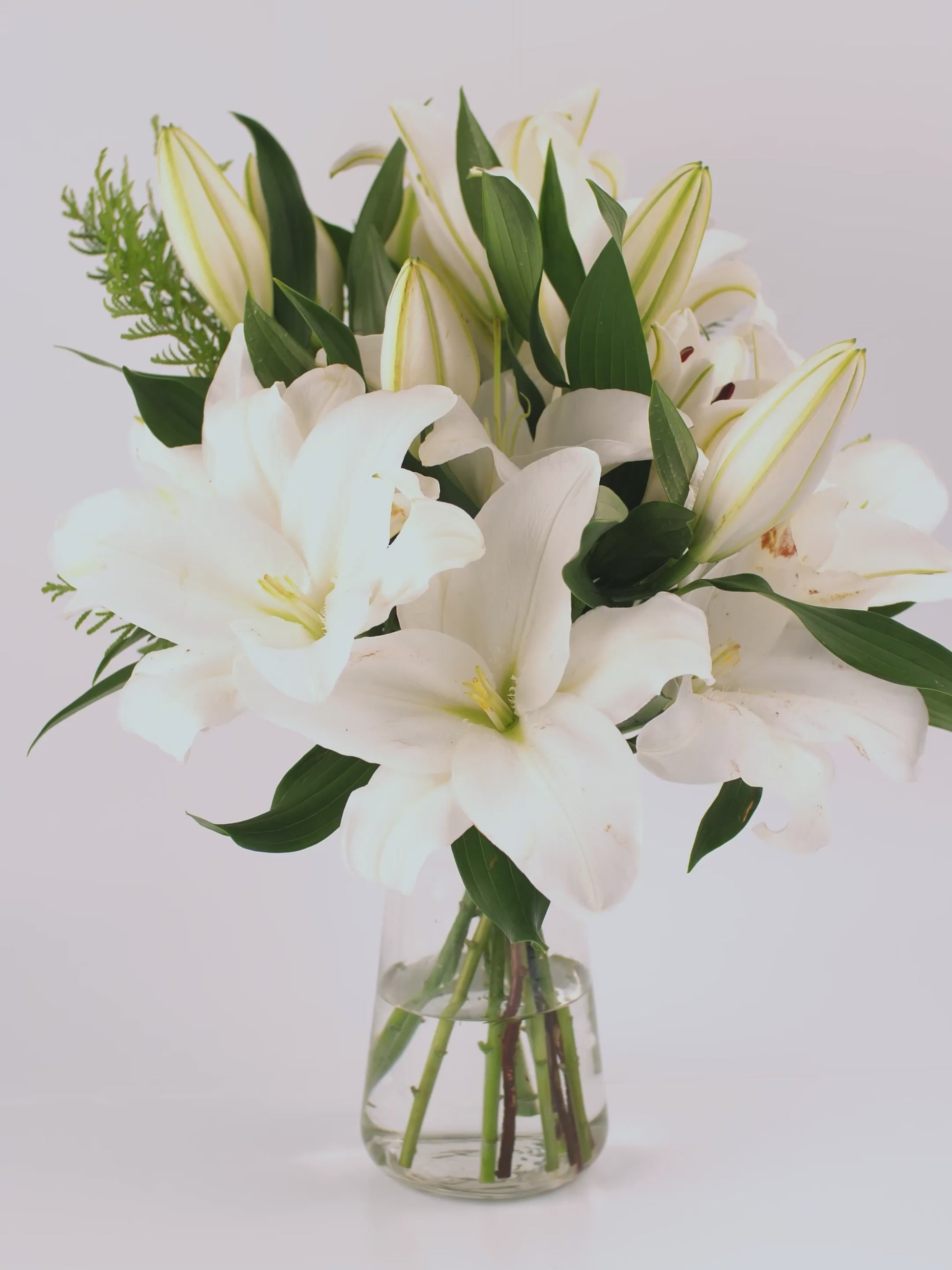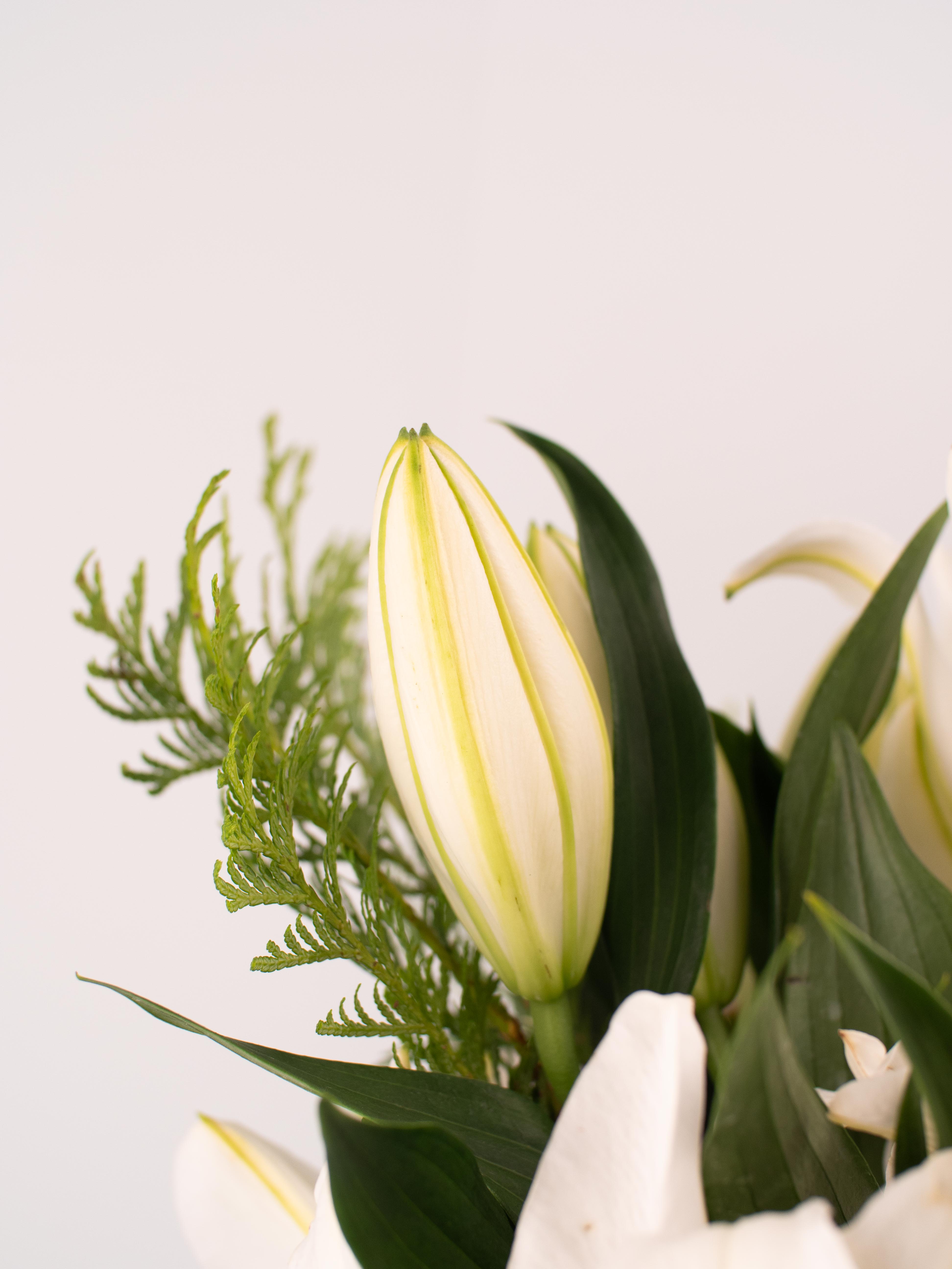 Los liliums orientales blancos son simplemente espectaculares, tanto por su belleza como por su delicado aroma. Llegan cerrados y se van abriendo poco a poco, permitiéndote disfrutar de ellos durante muchos días. Un ramo ideal para decorar tu hogar o para regalar a alguien especial.