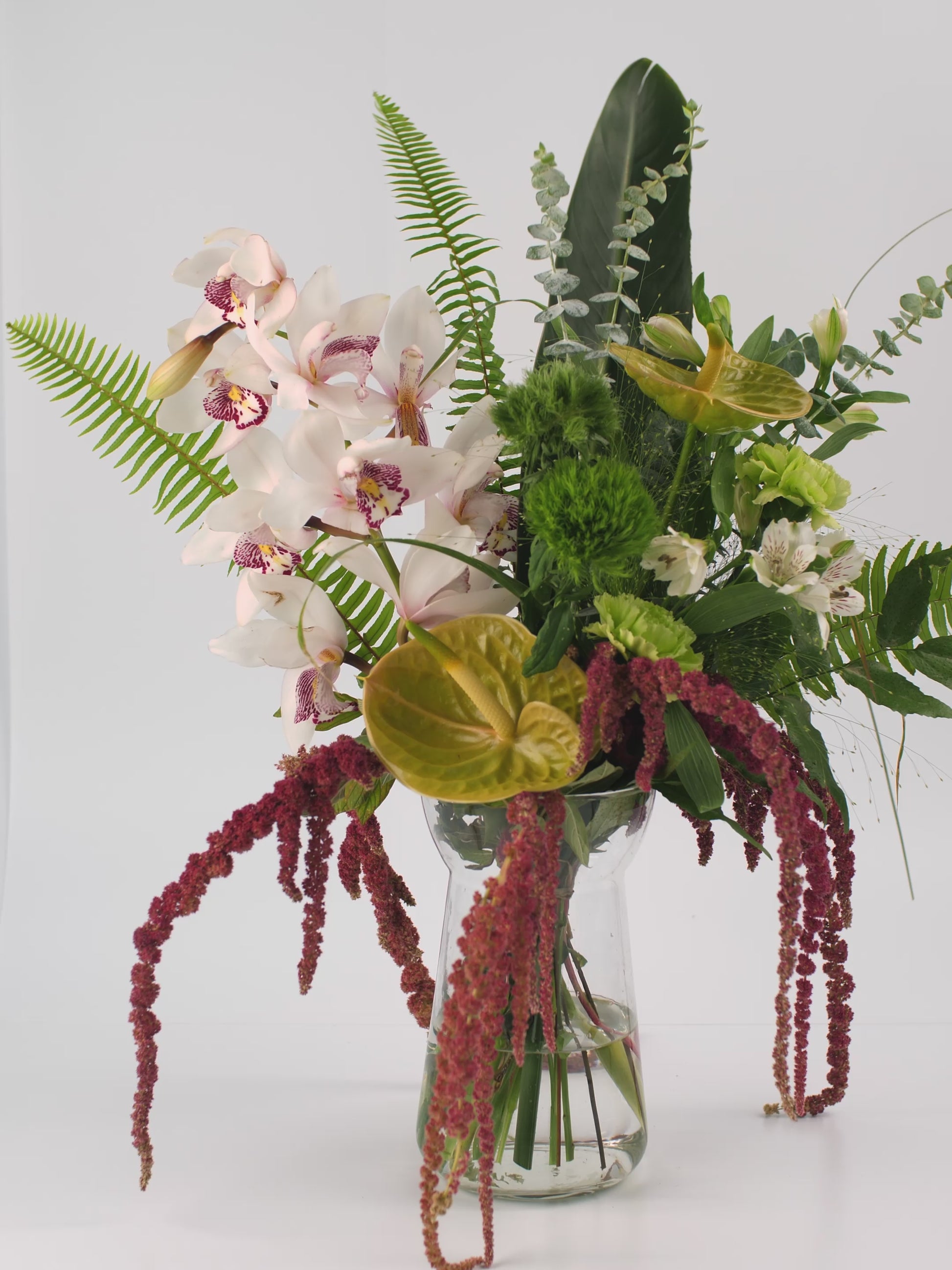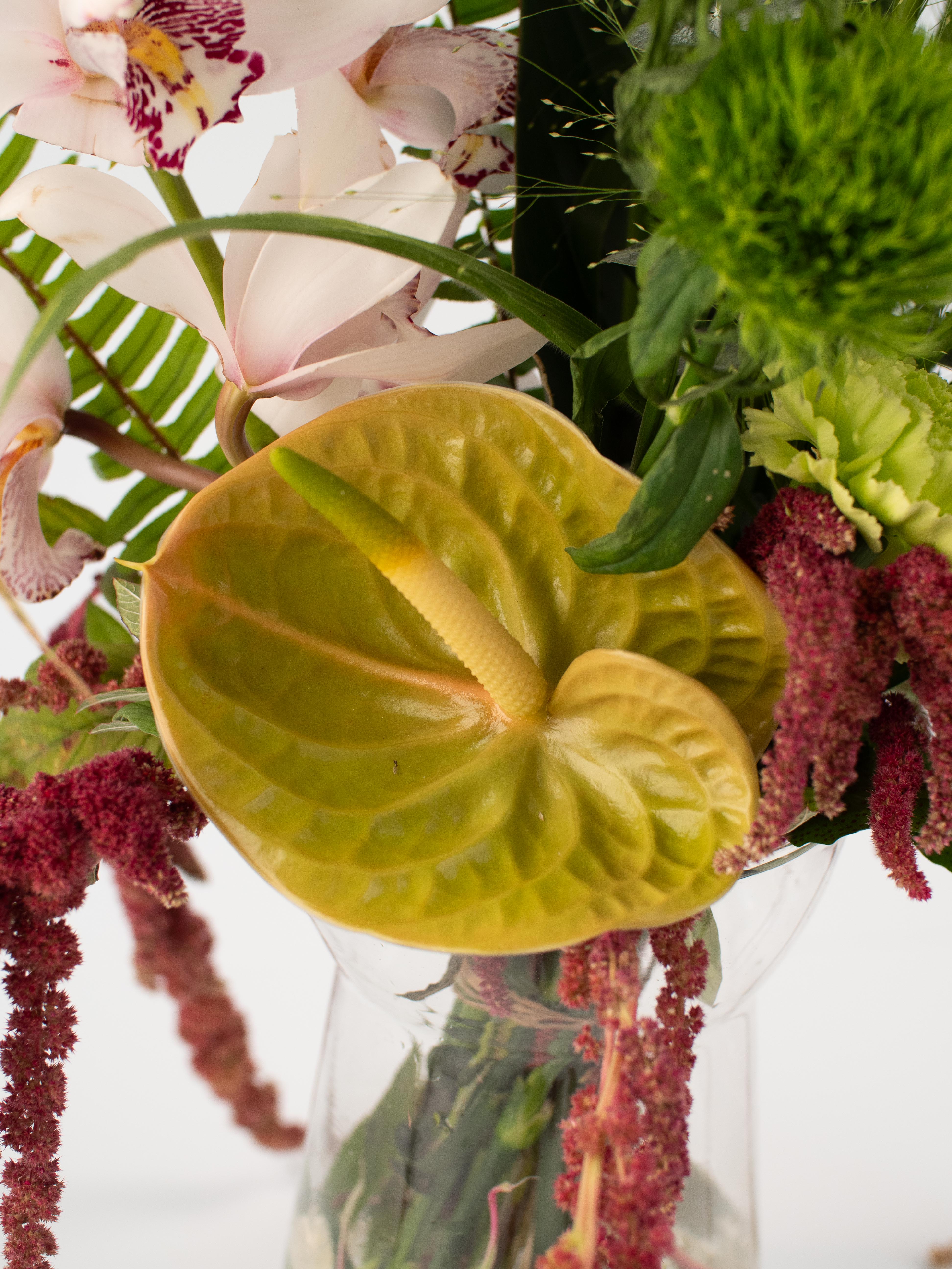 Espectacular ramo que combina flores como el anthurium, que preside la composición, la orquídea, la strelitzia y el amaranthus. Es el ramo ideal para impresionar, tanto si lo pides para tu casa como si lo quieres regalar.