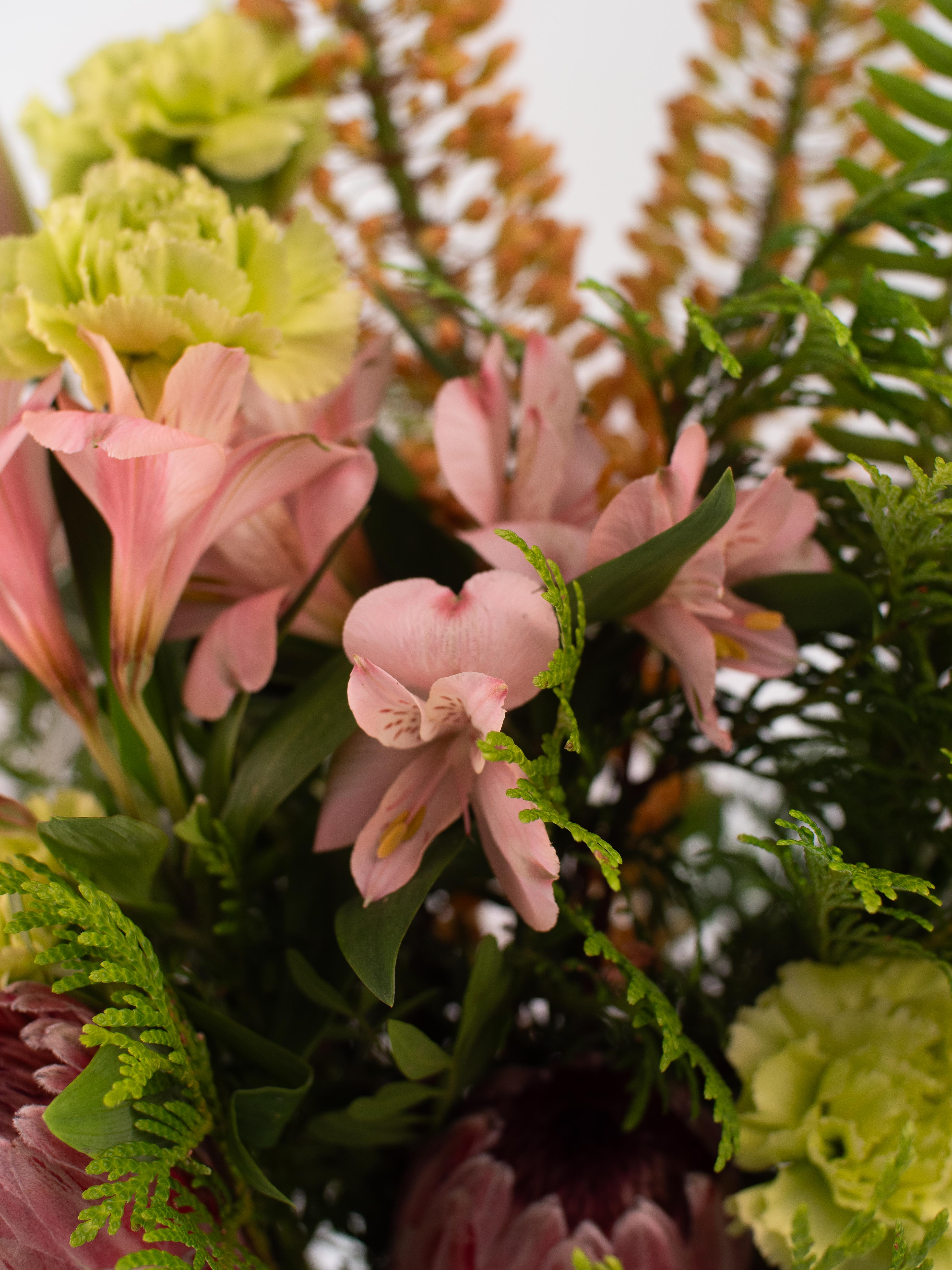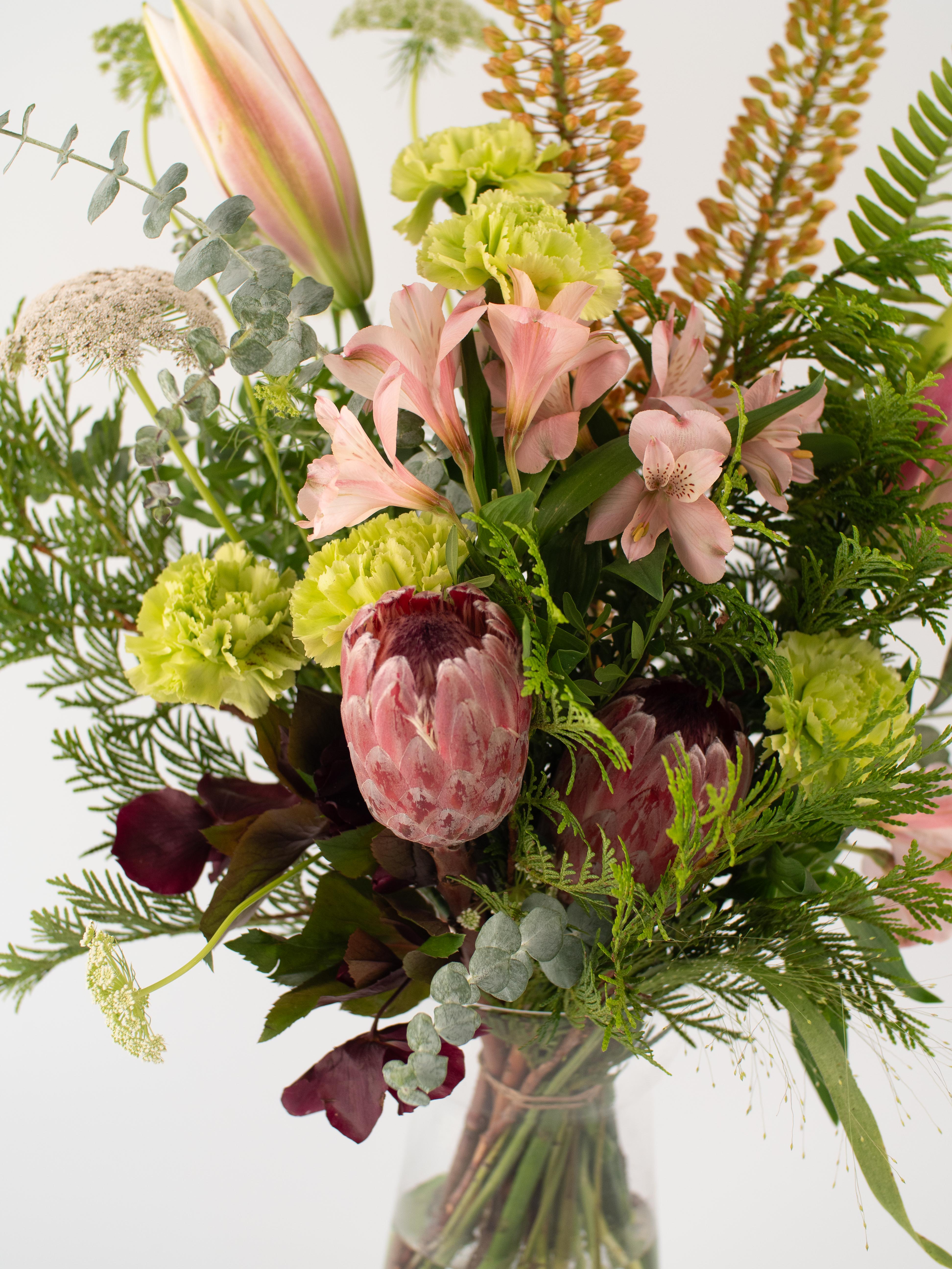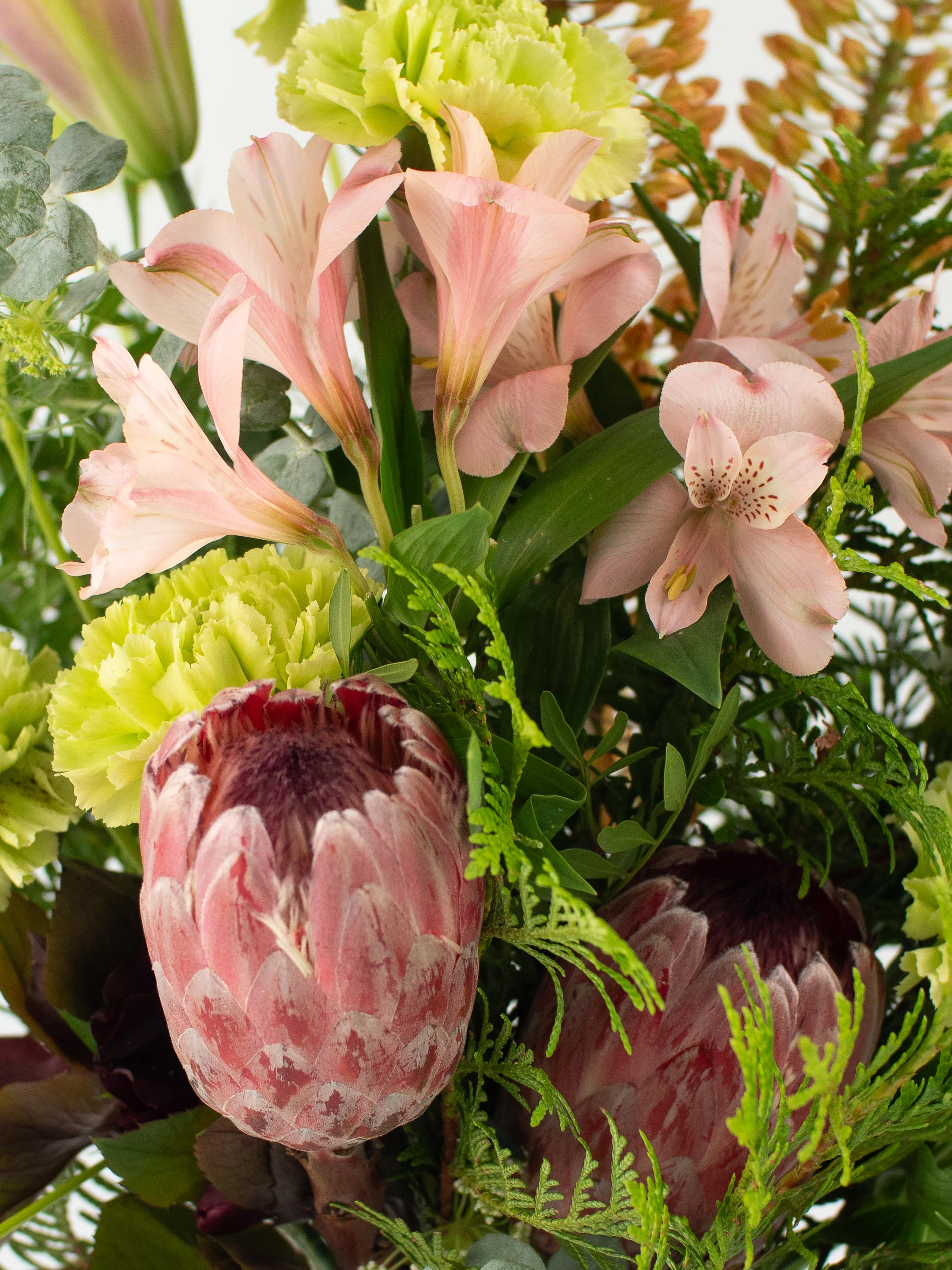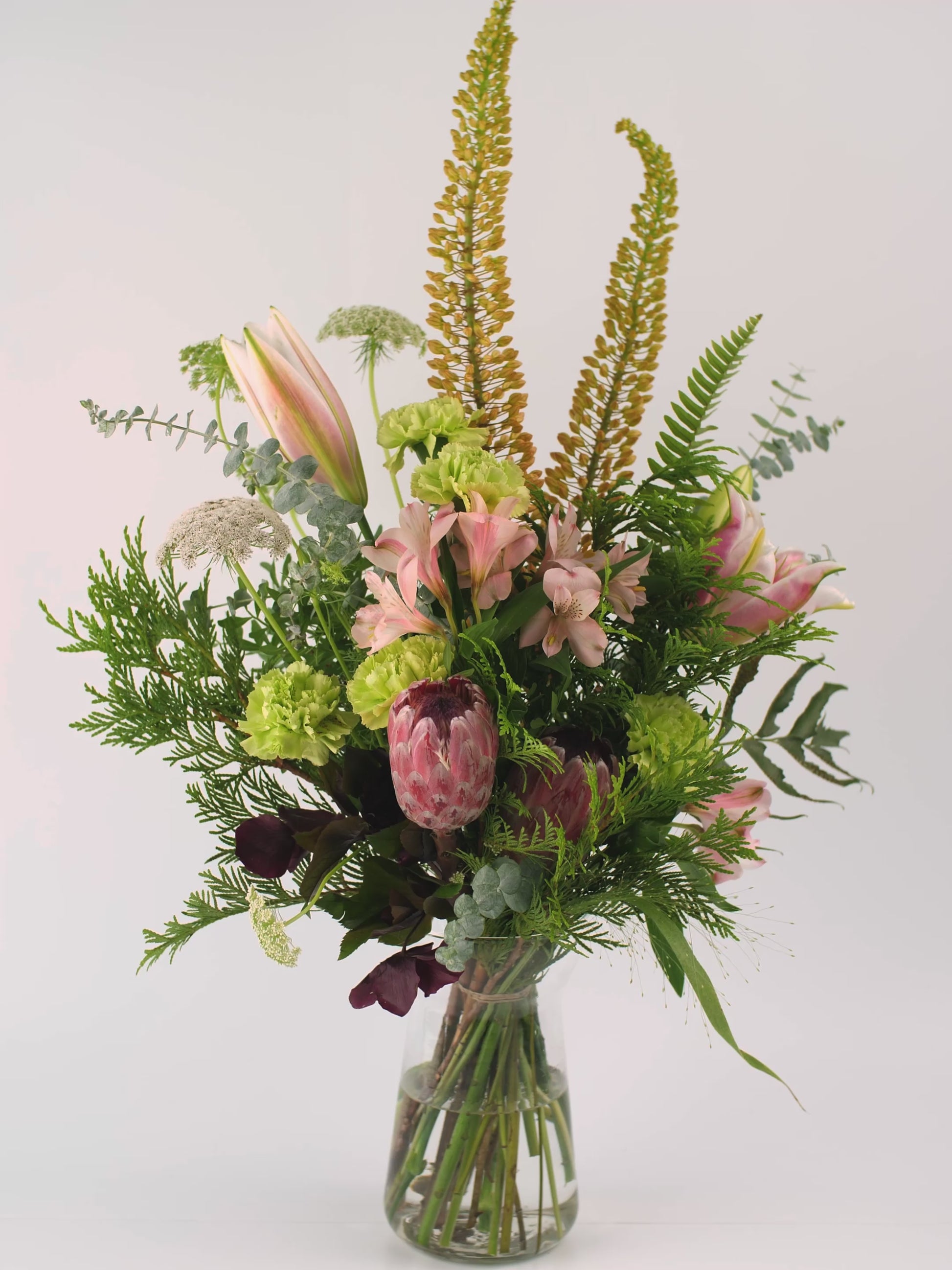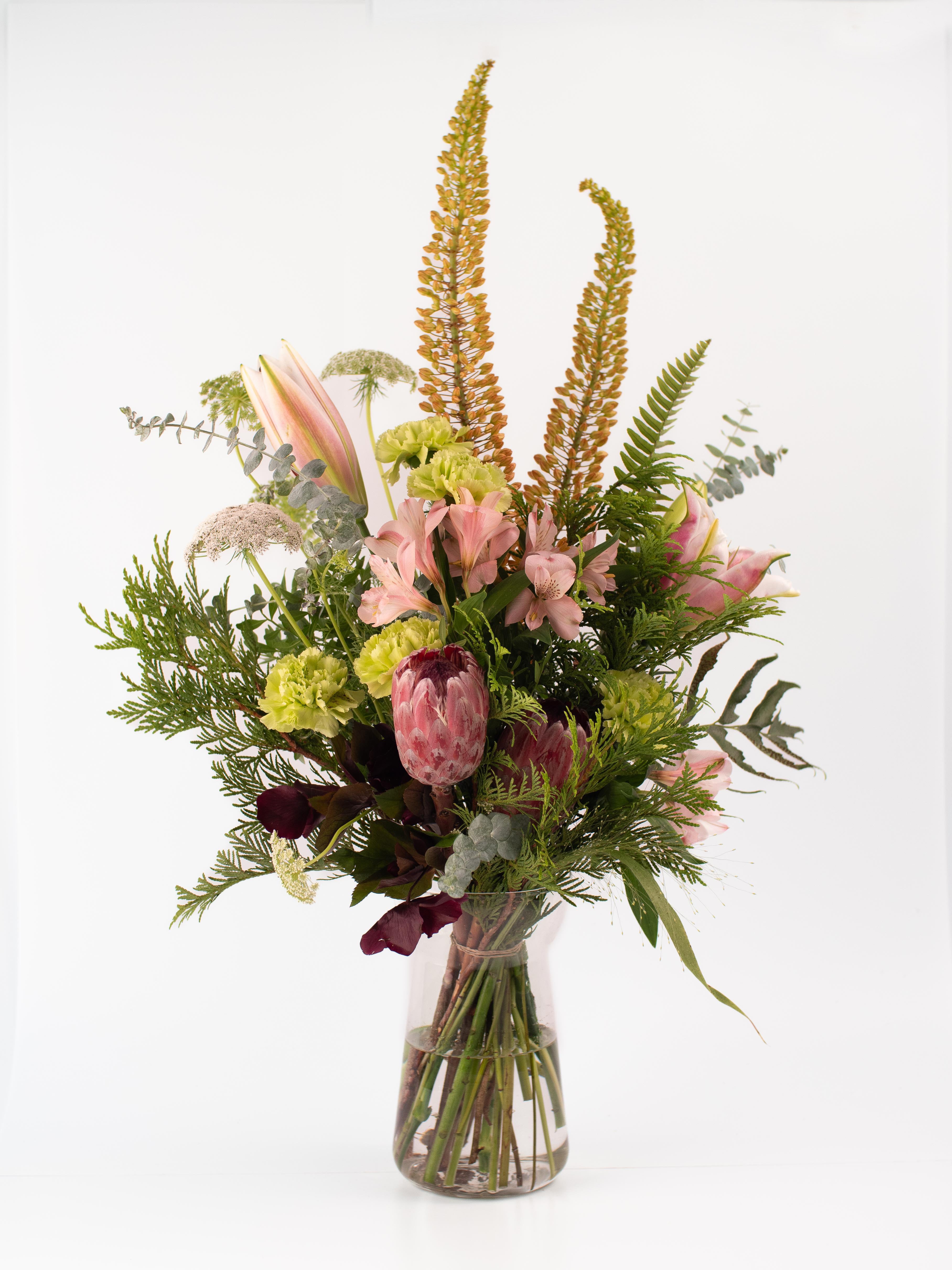 Uno de nuestros ramos más espectaculares, y de los únicos que solo tenemos en tamaño grande. Entre otras flores, contiene dos hermosas proteas venus, lilium oriental rosa, alstroemeria, eremurus y abundante follaje verde. Este ramo no deja indiferente, tanto si lo compras para ti como si lo regalas.