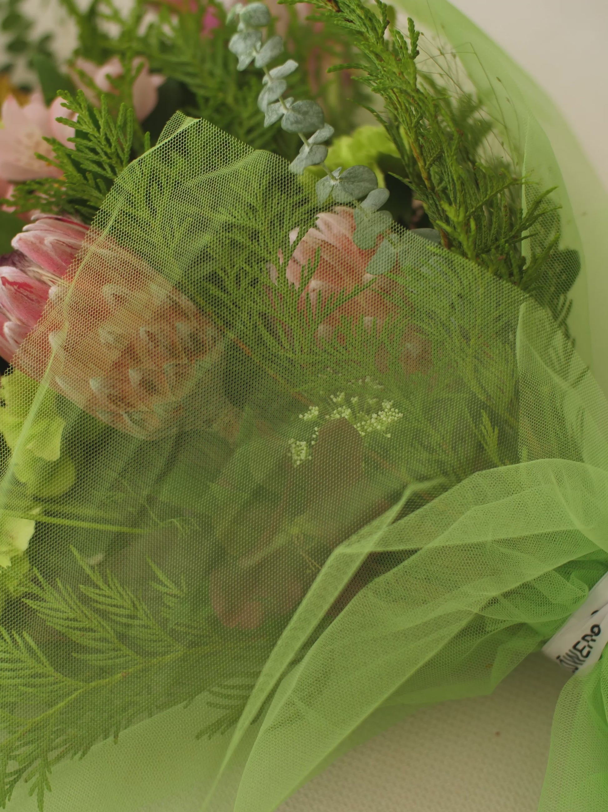 Para que tu ramo llegue en perfectas condiciones, envolvemos los tallos con un paño húmedo especialmente diseñado para mantener las flores frescas e hidratadas durante el transporte.