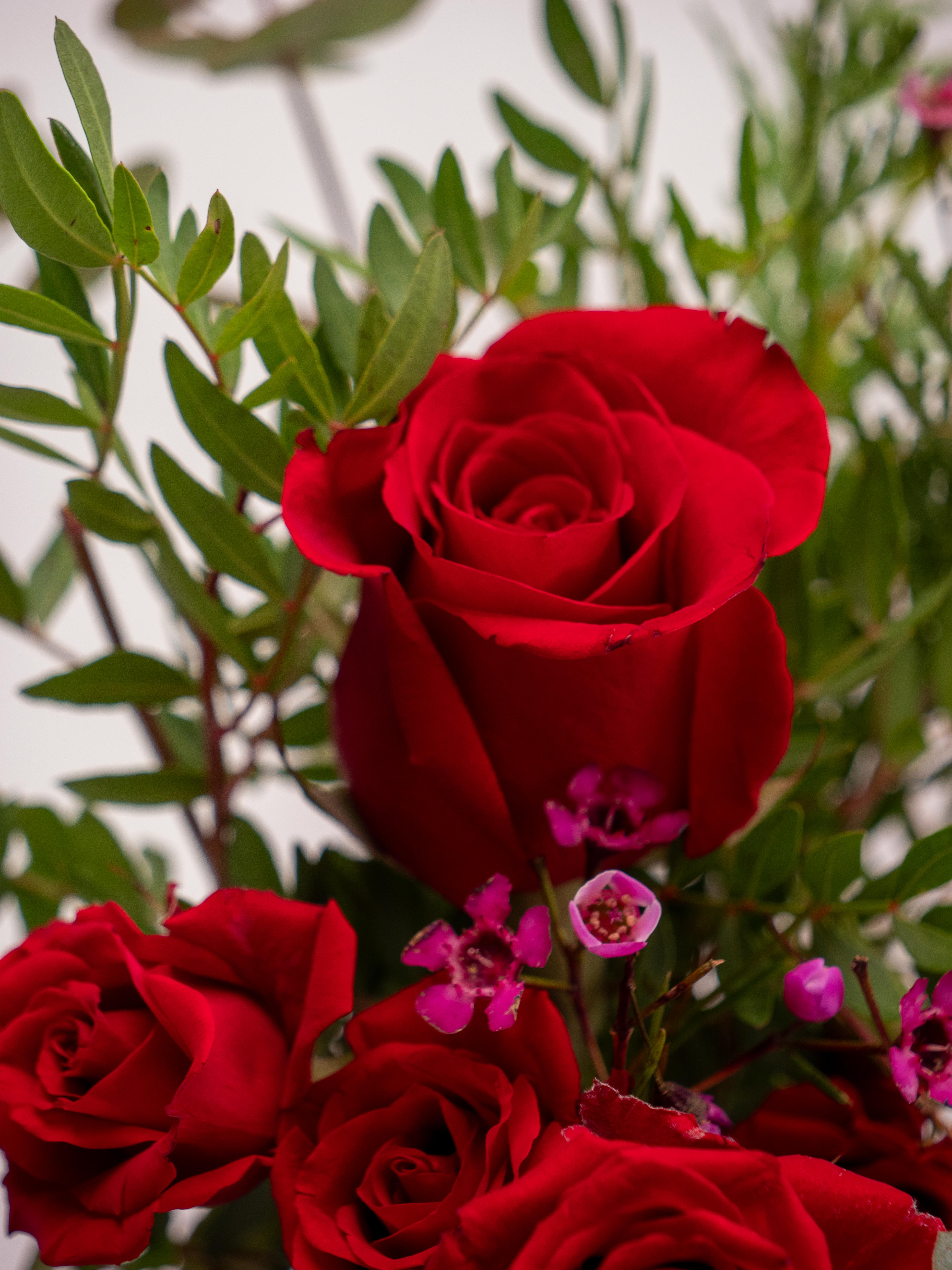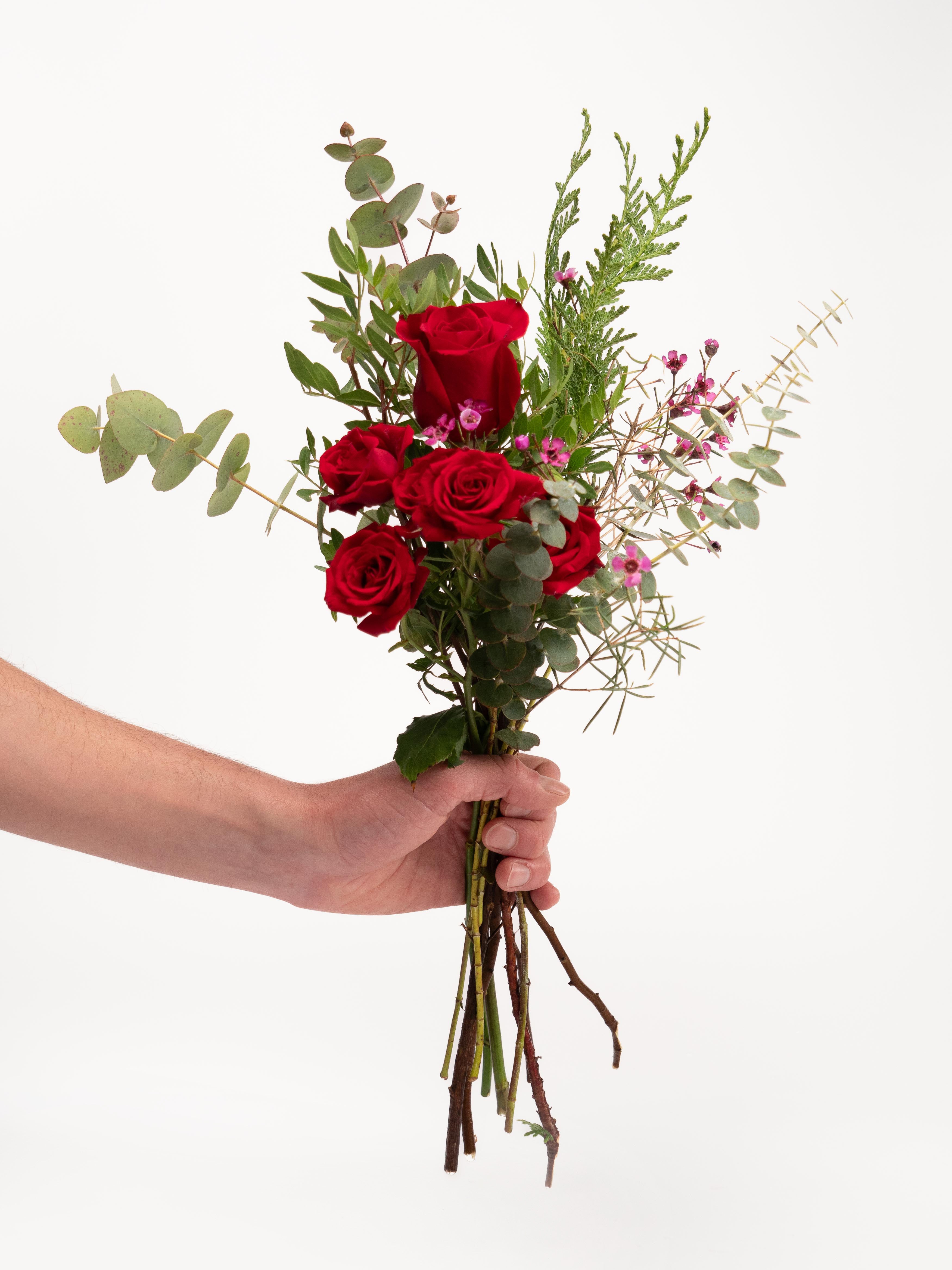 Ramo pequeño de rosas rojas de distintos tamaños, eucalipto y flor de cera. Un ramo de rosas con un toque moderno y original. Es ideal para regalar.