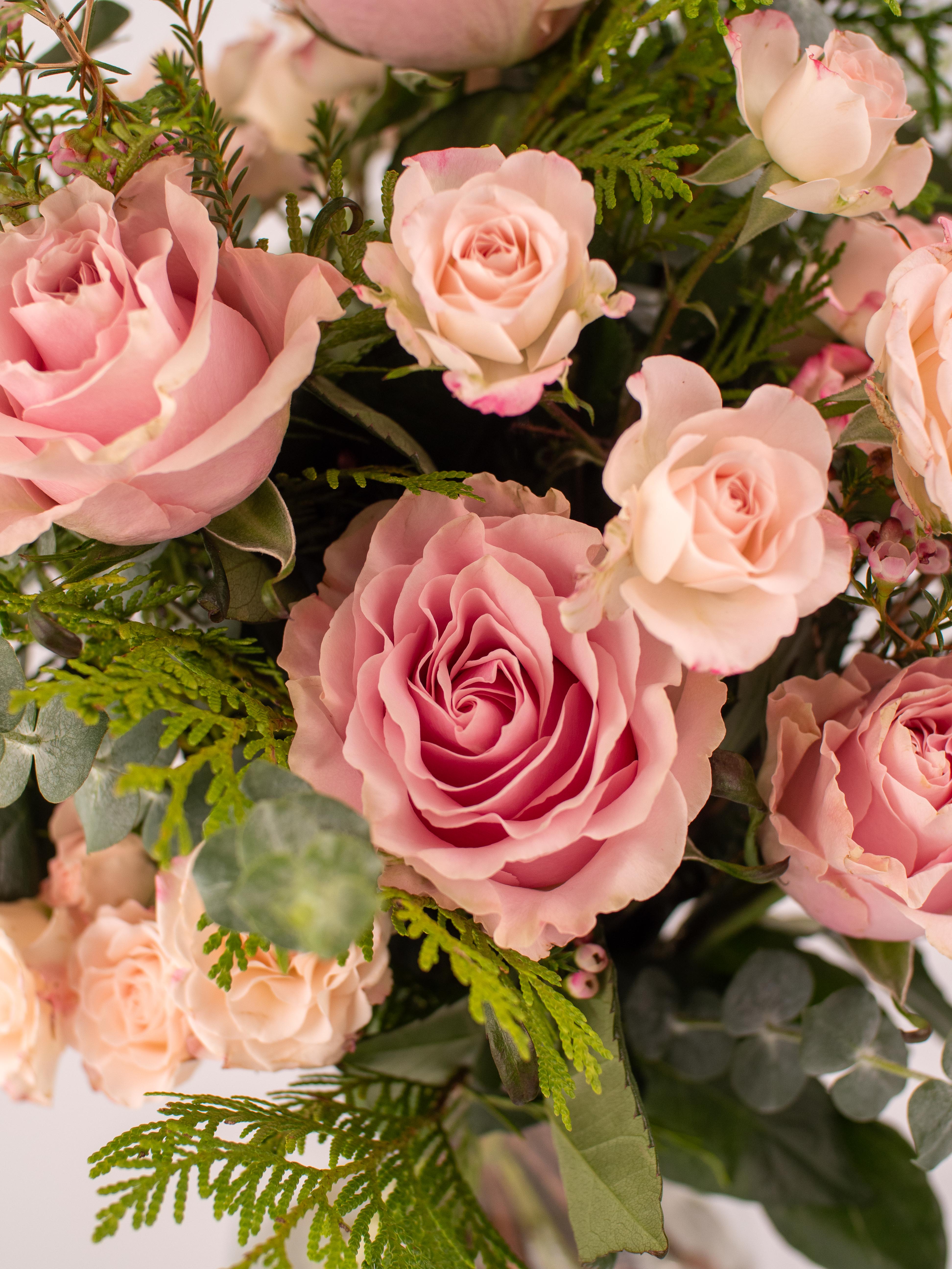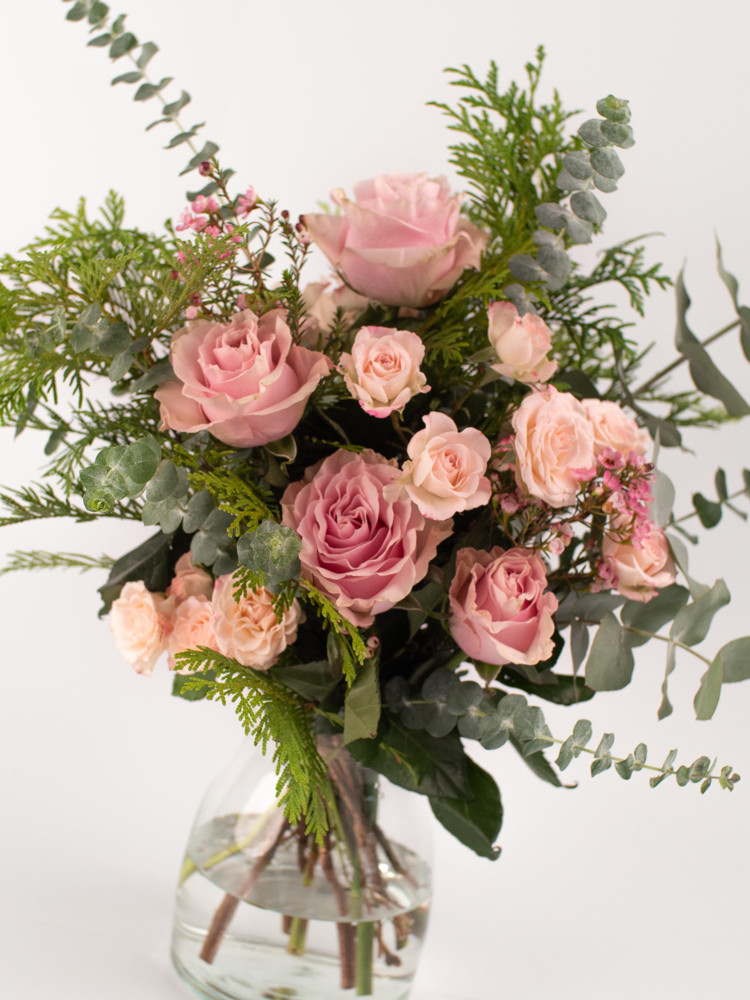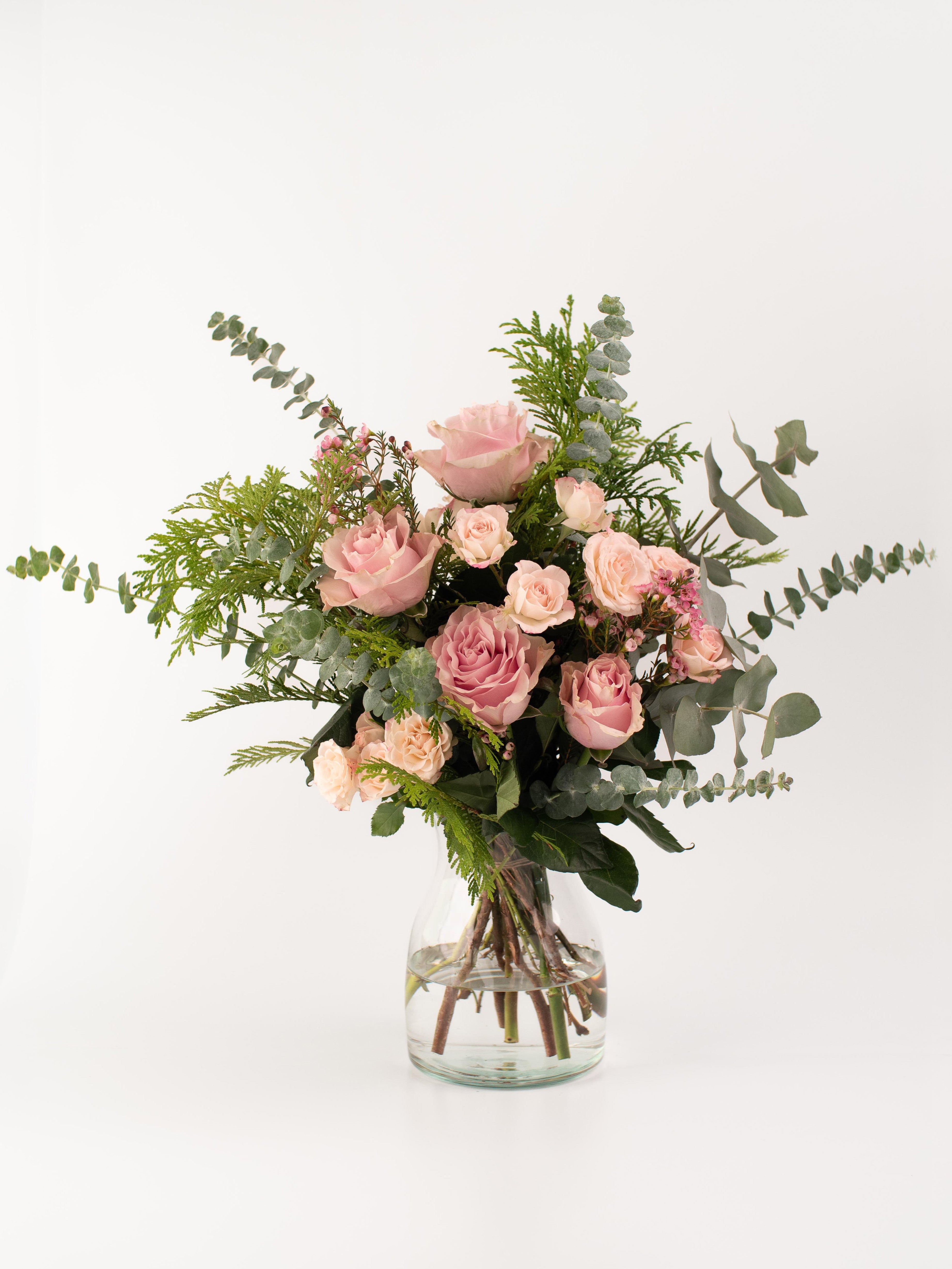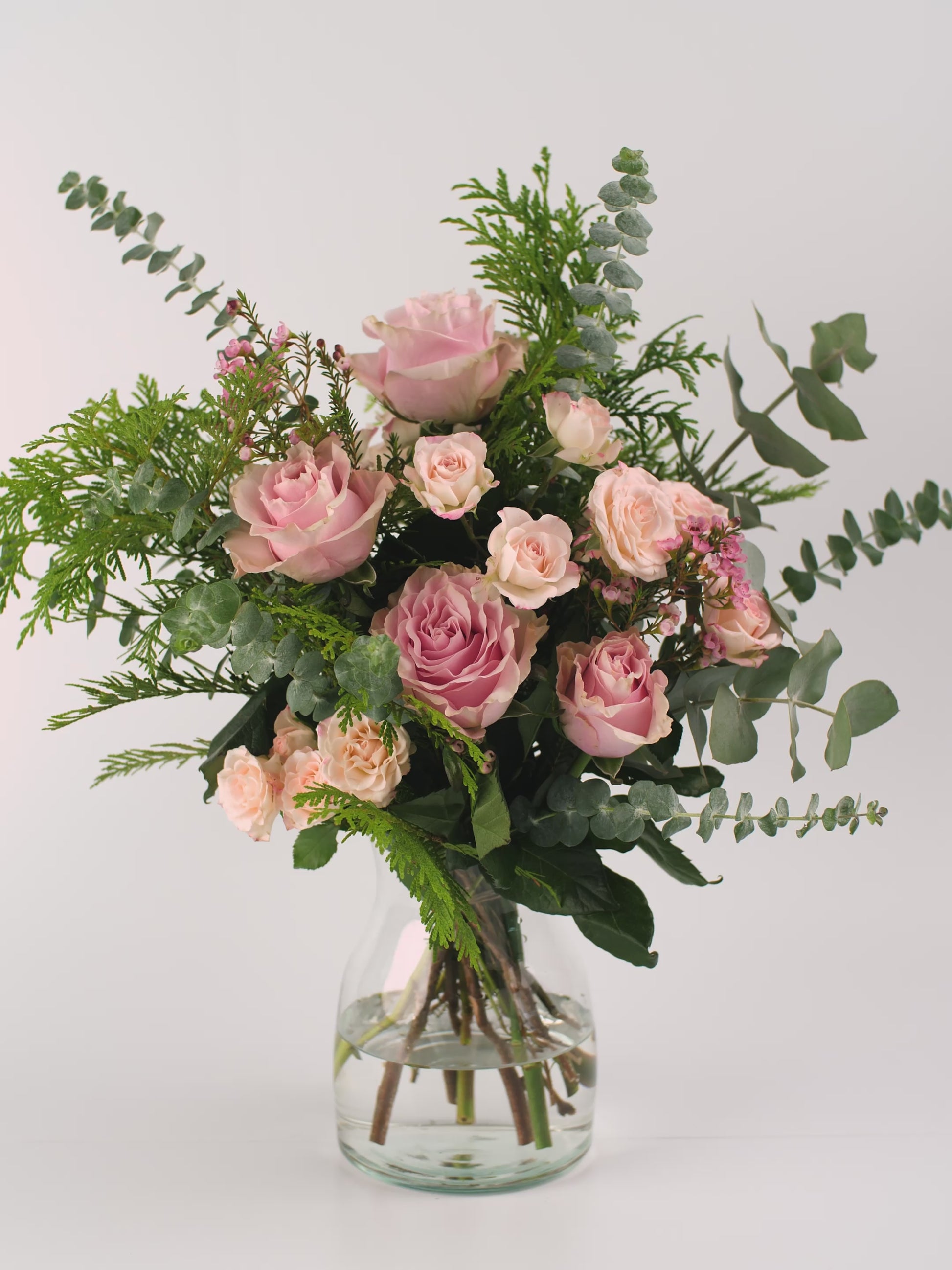 Ramo de rosas rosas de distintos tamaños, eucalipto y flor de cera rosa. Un ramo de rosas con un toque moderno y original, ideal para regalar.