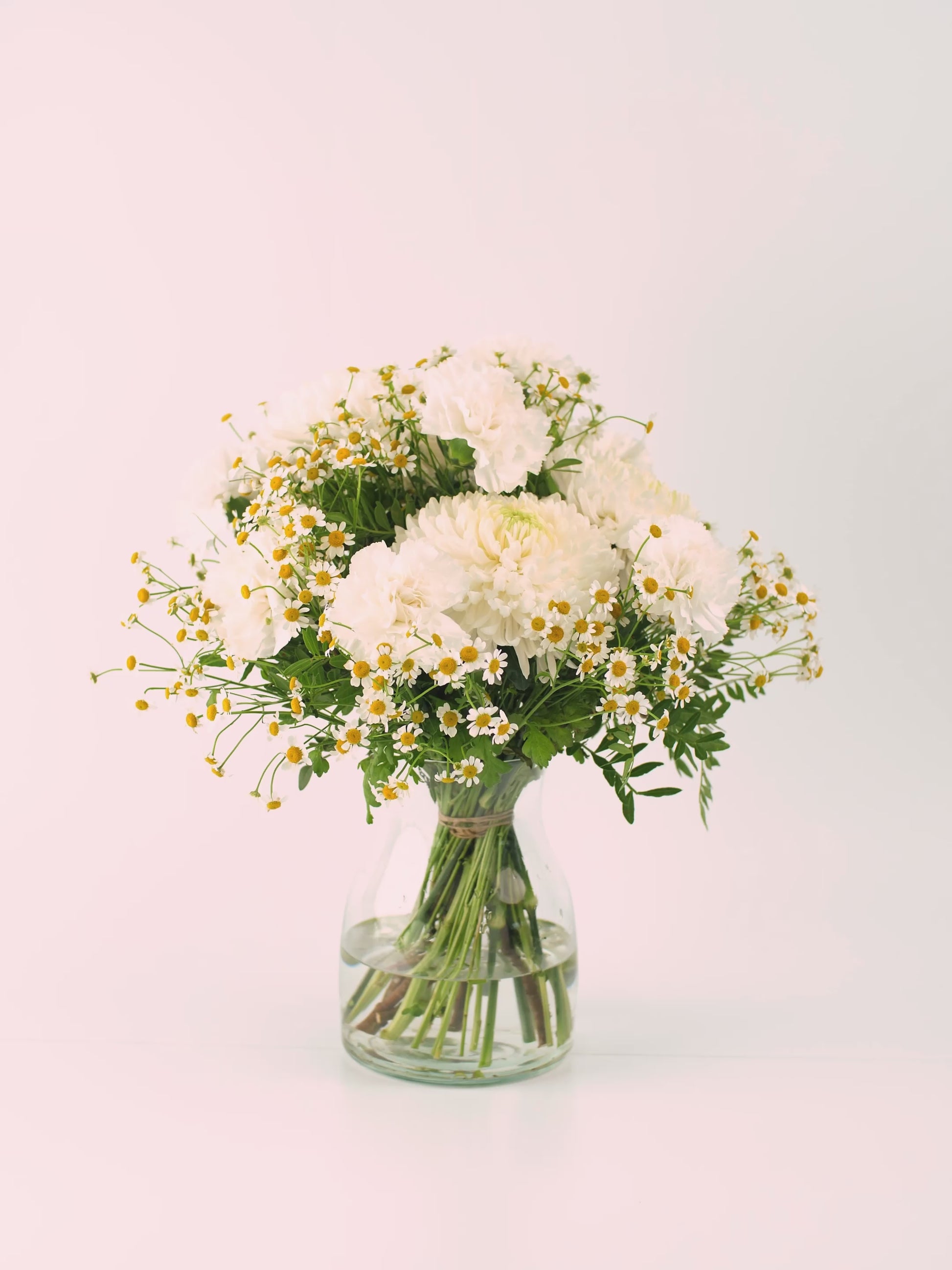 Ramo muy bonito de estética silvestre. Nos encanta la naturalidad que transmite. La combinación de margaritas, crisantemos y claveles blancos resulta ideal.
