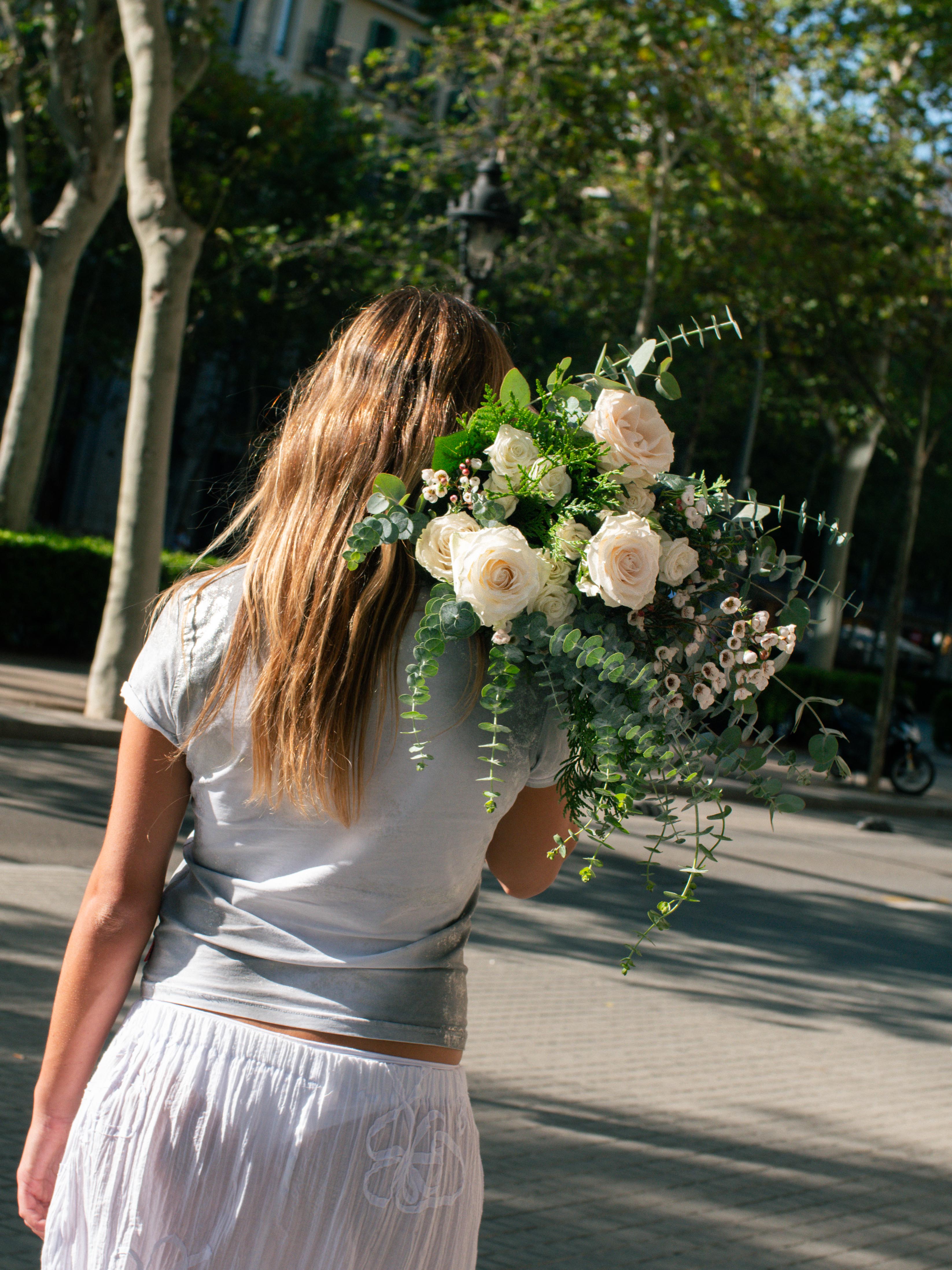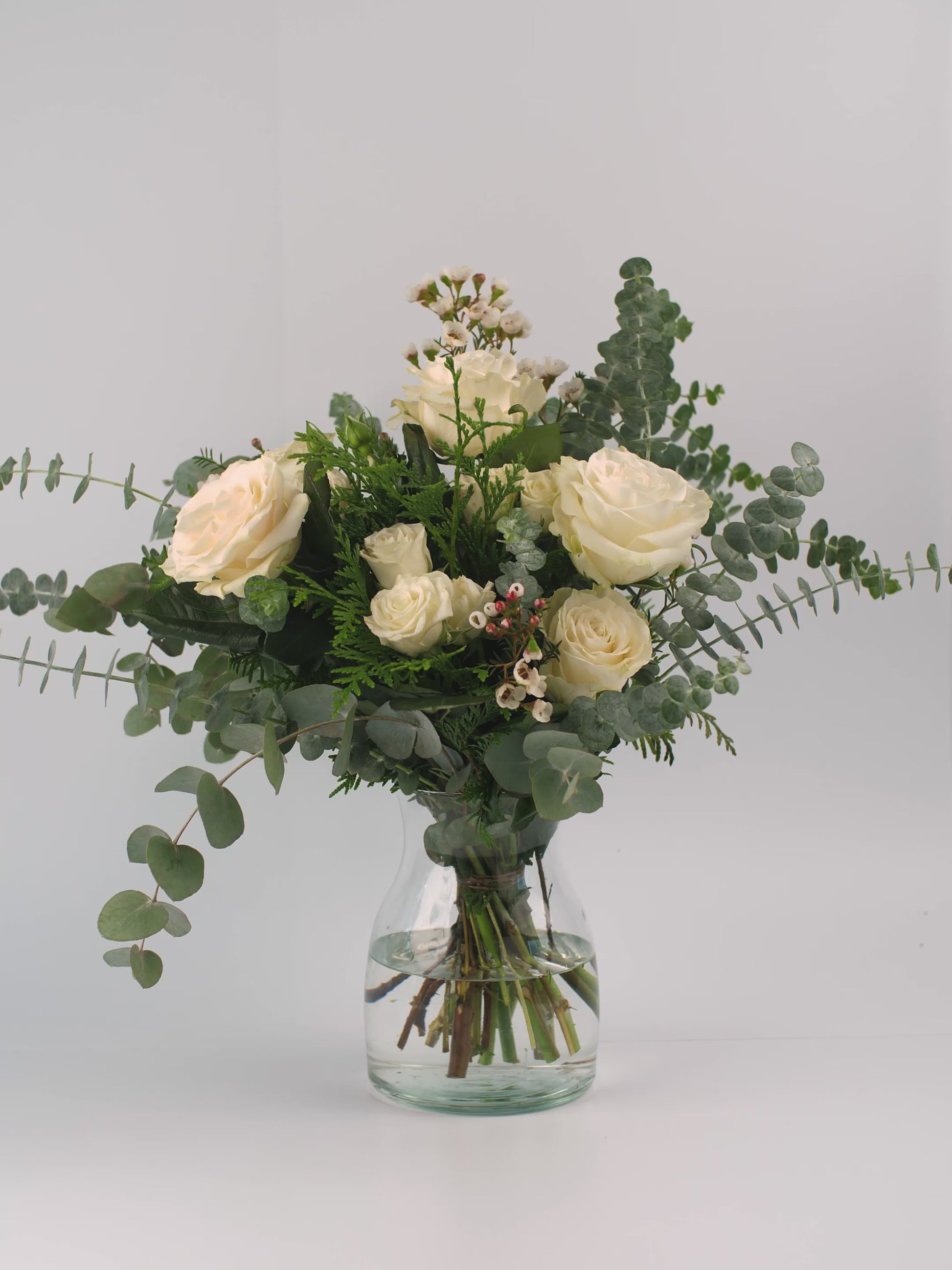 Ramo de rosas blancas de distintos tamaños, eucalipto y flor de cera. Un ramo de rosas con un toque moderno y original, ideal para regalar.
