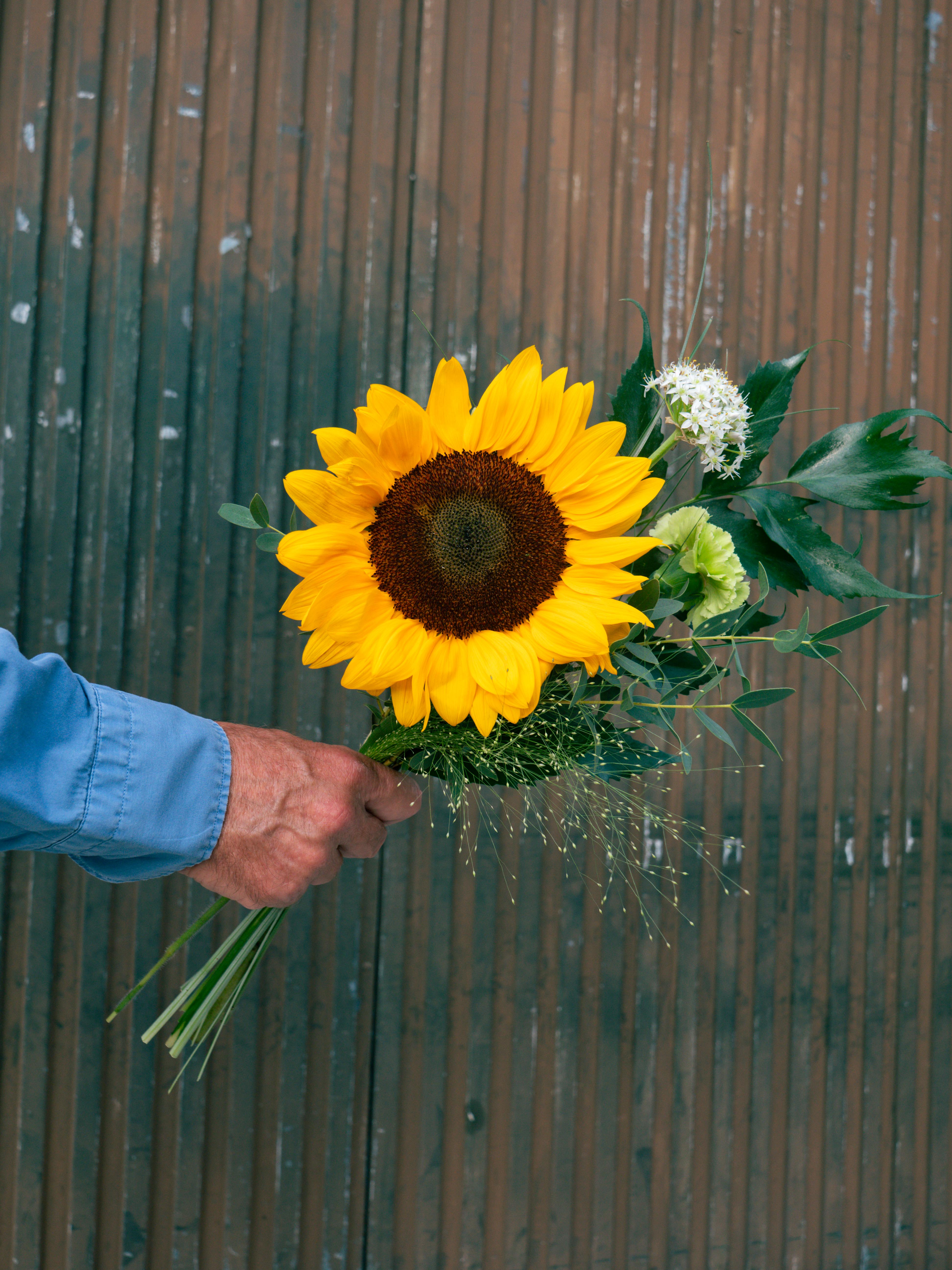 A este tipo de ramo le llamamos detalle. Más que un ramo, es una pequeña composición presidida por un girasol y acompañada de Allium nigrum y follaje verde. Es un detalle ideal para sorprender