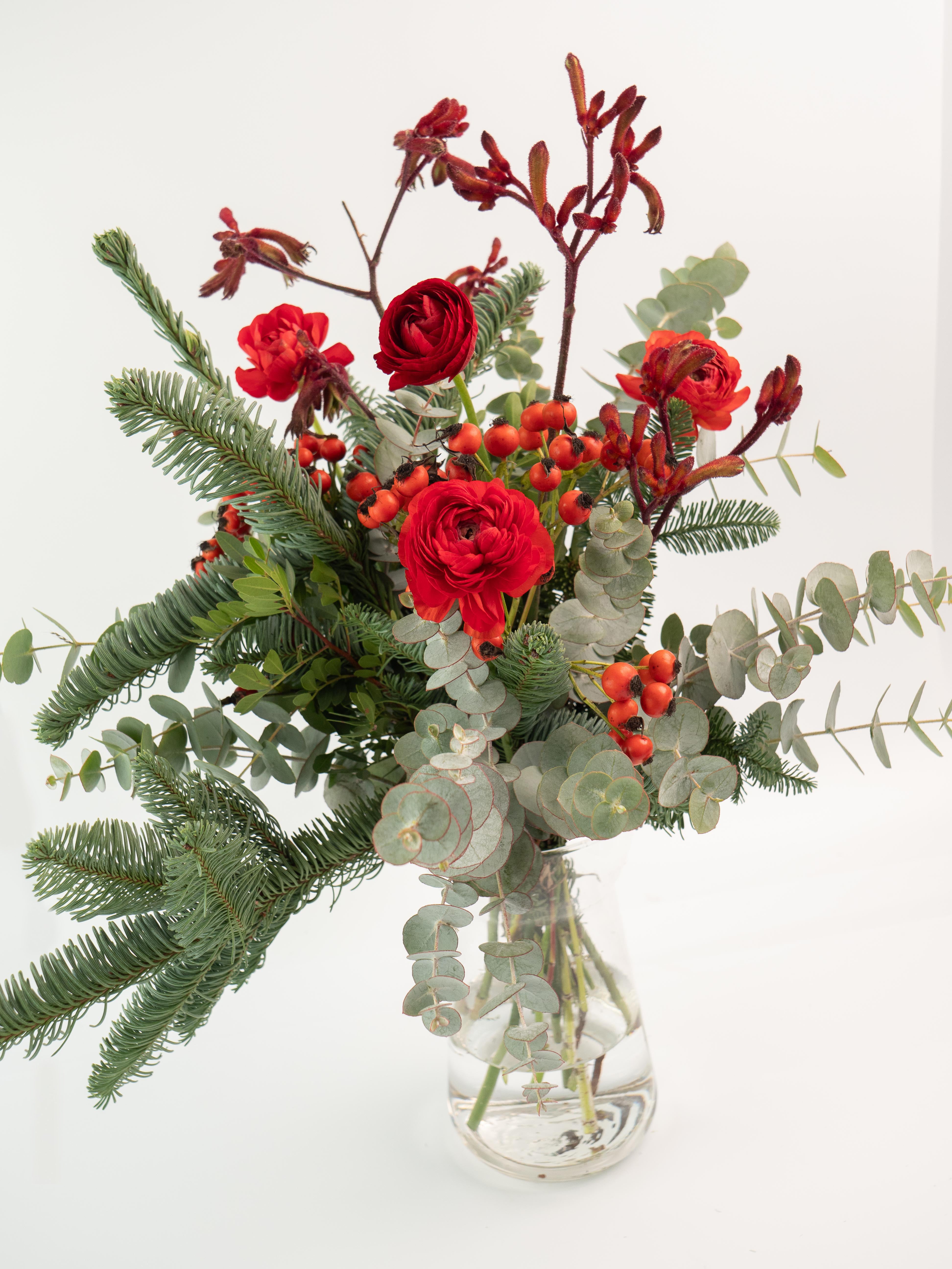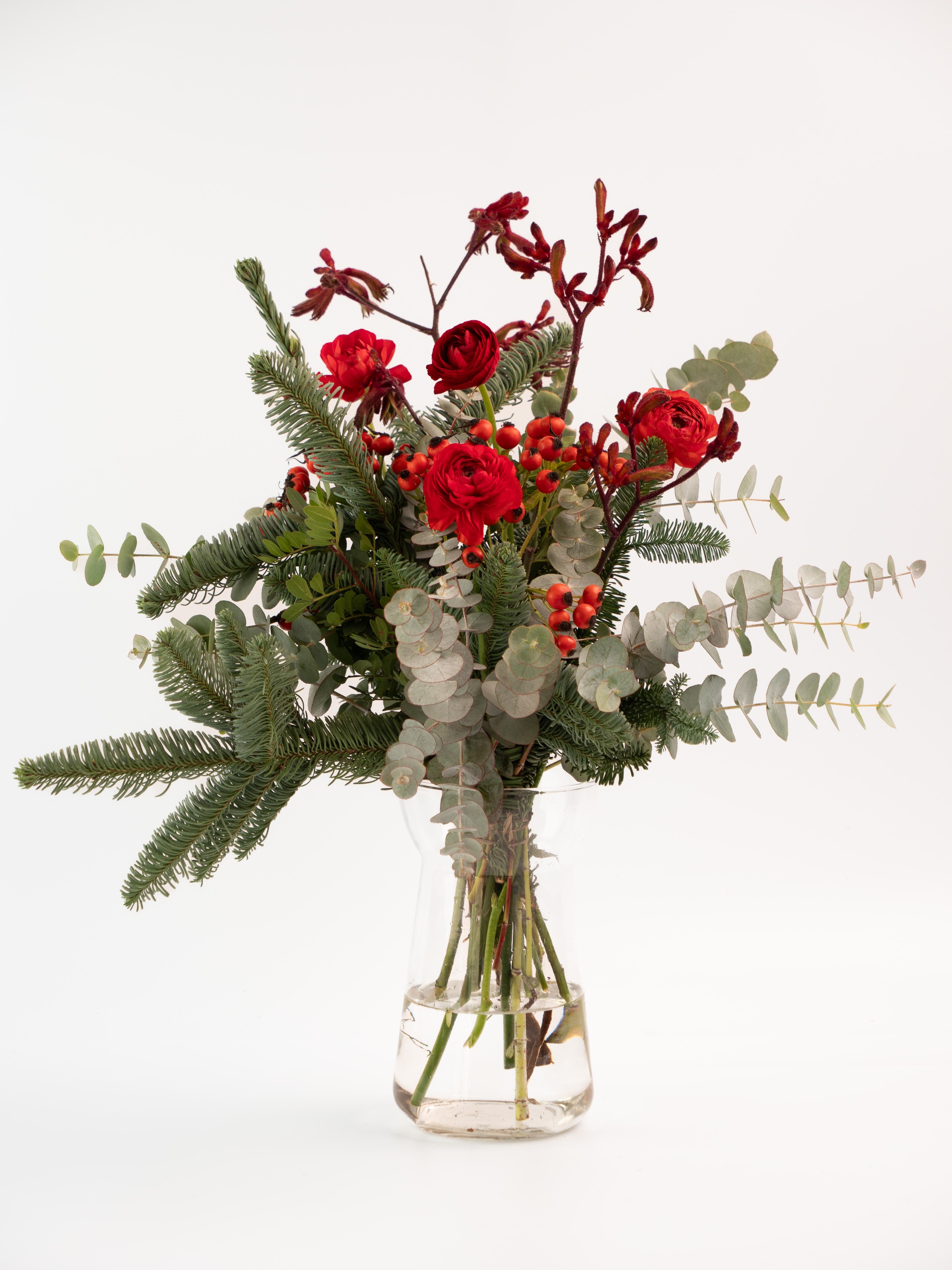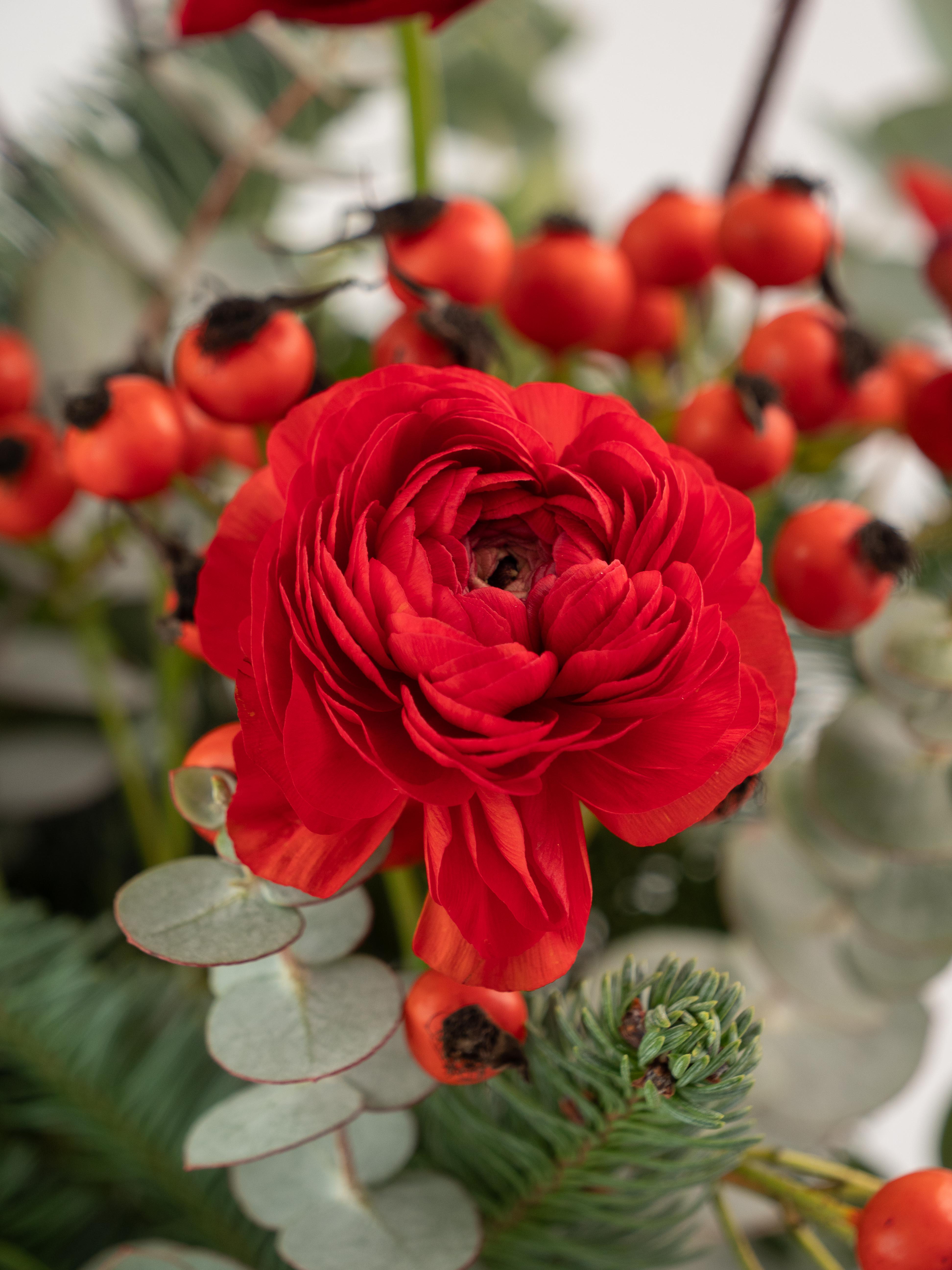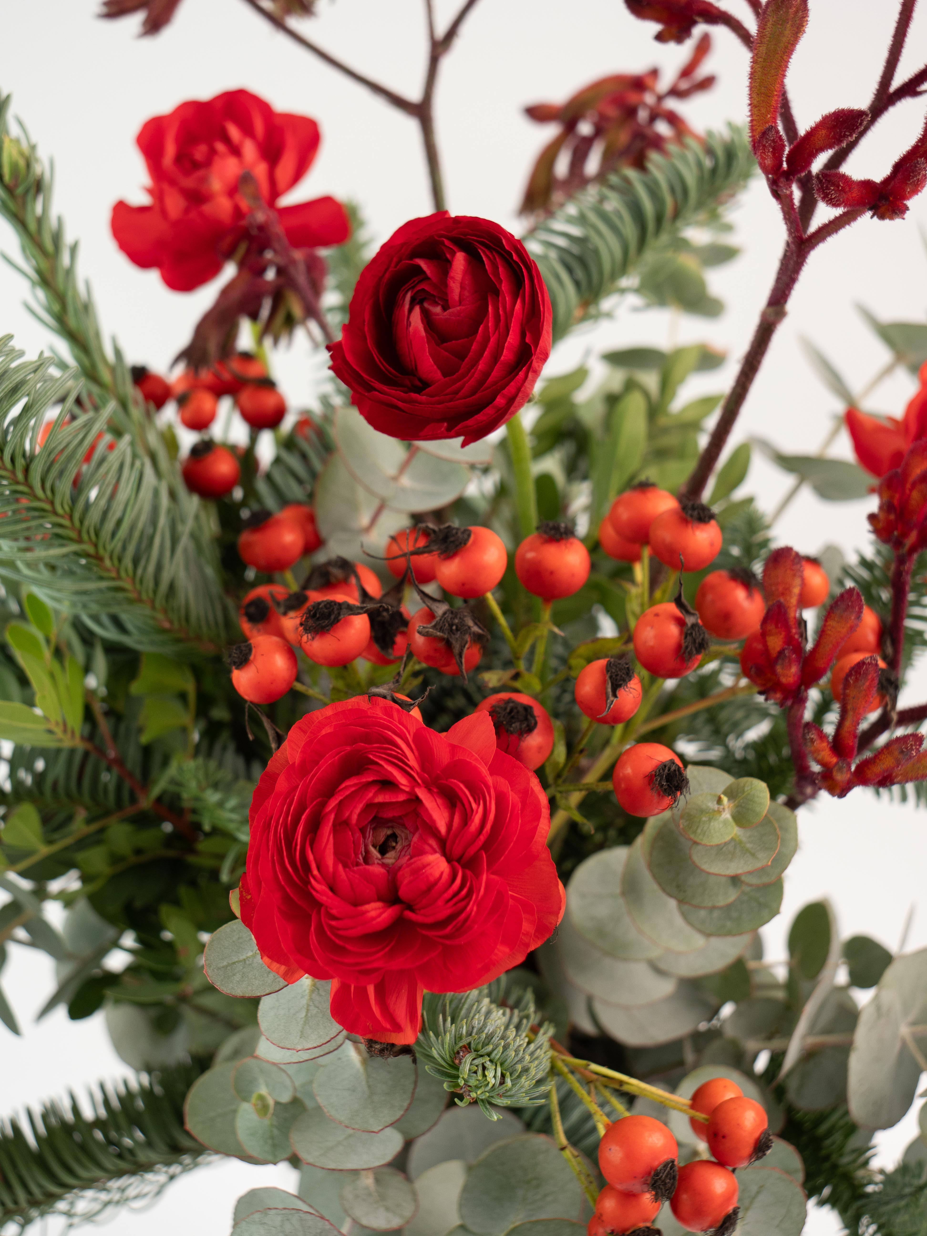 Nos encanta el contraste entre los tonos rojo y granate del ranúnculo y el anigozanthus con el verde del eucalipto y el abeto. Un ramo con personalidad, perfecto para regalar o para decorar cualquier rincón del hogar y darle un toque cálido y especial.