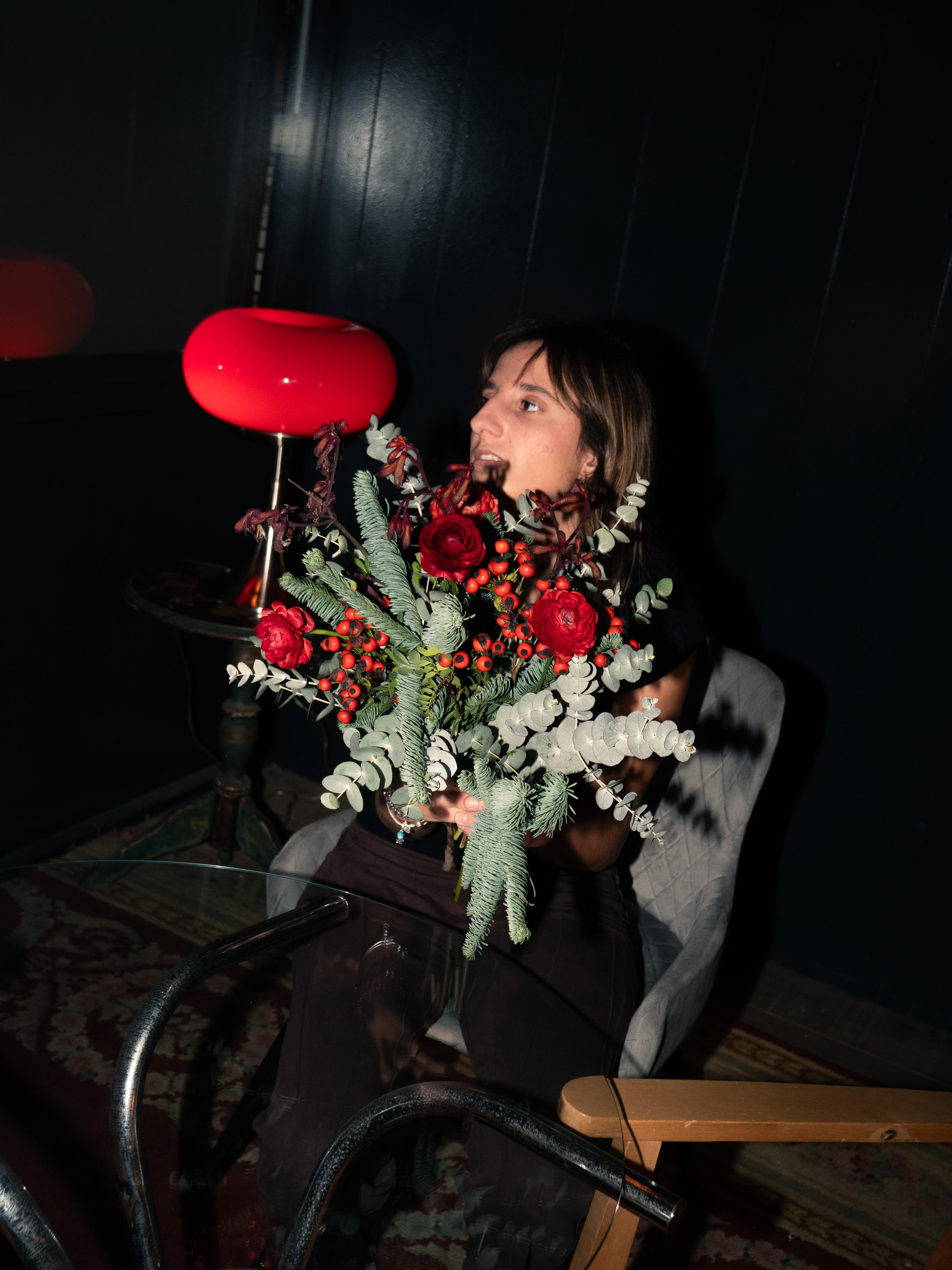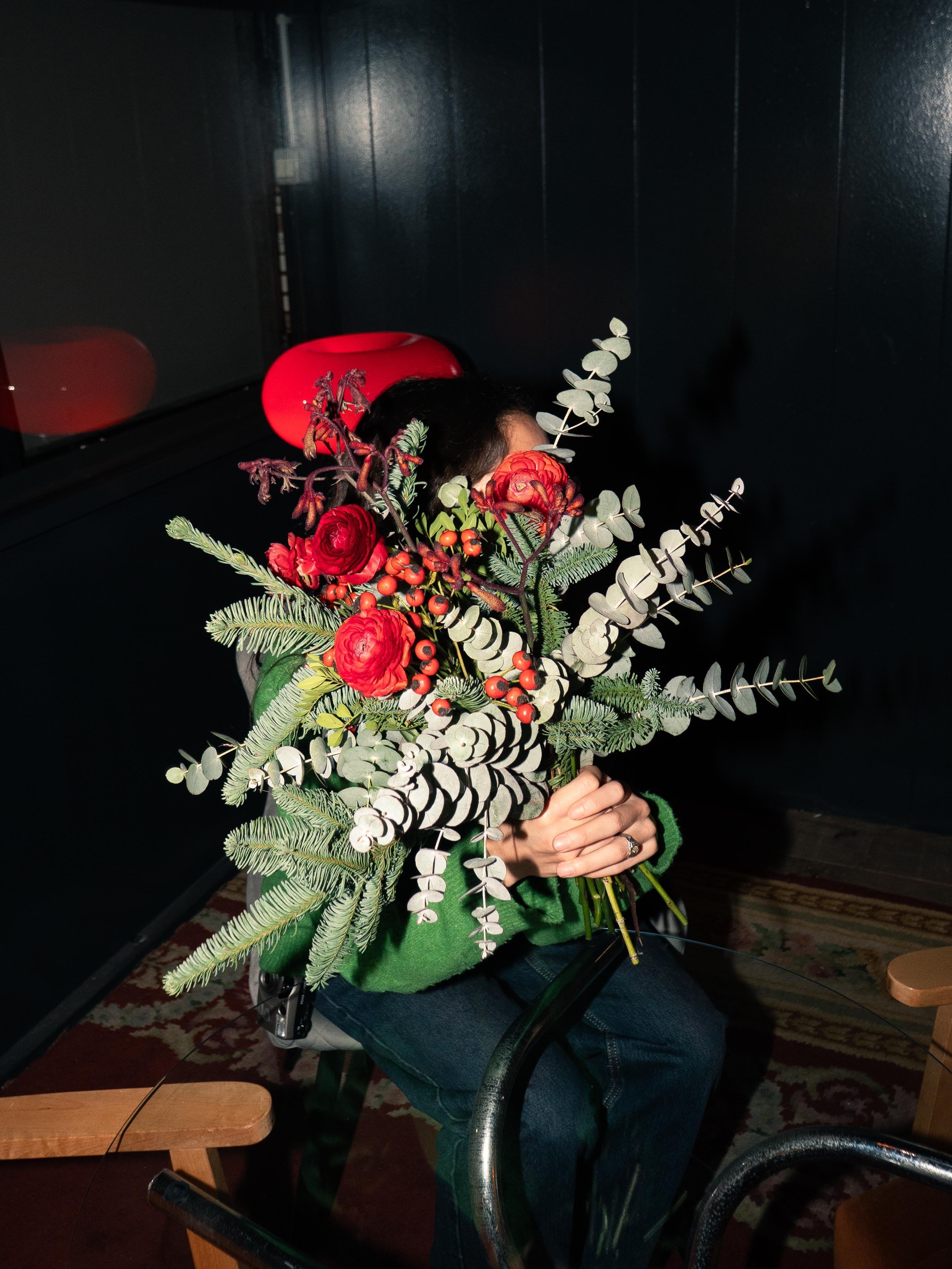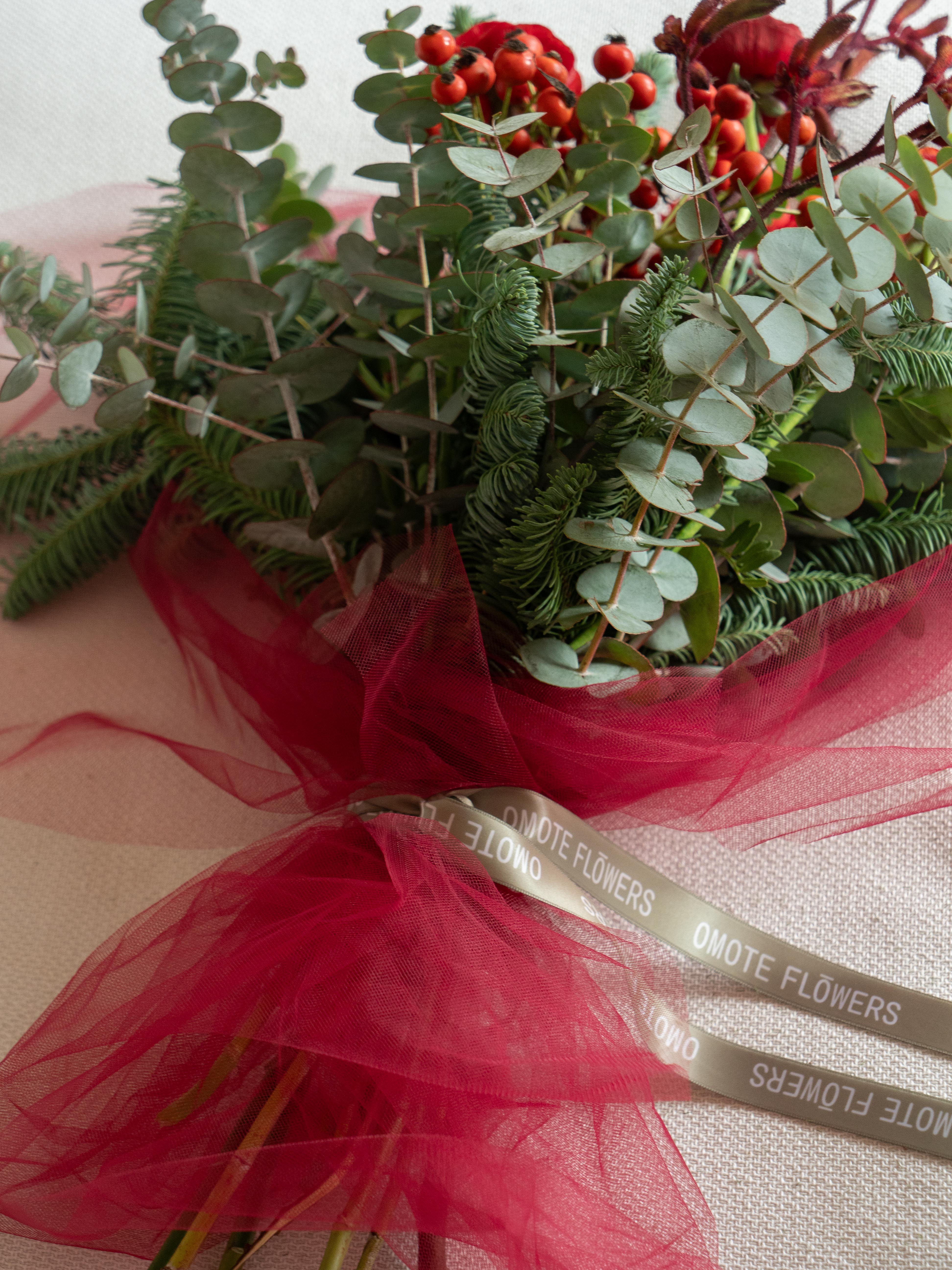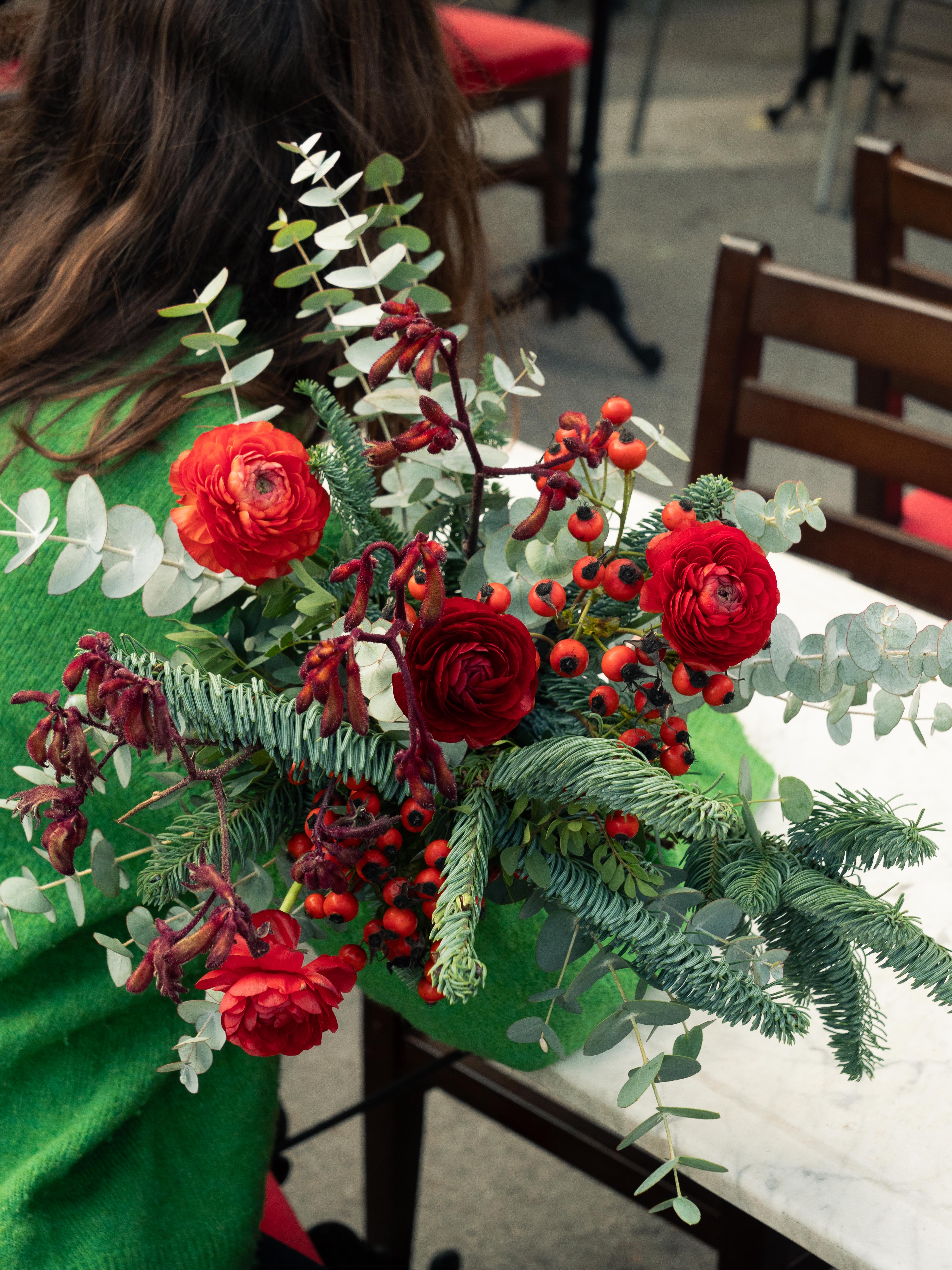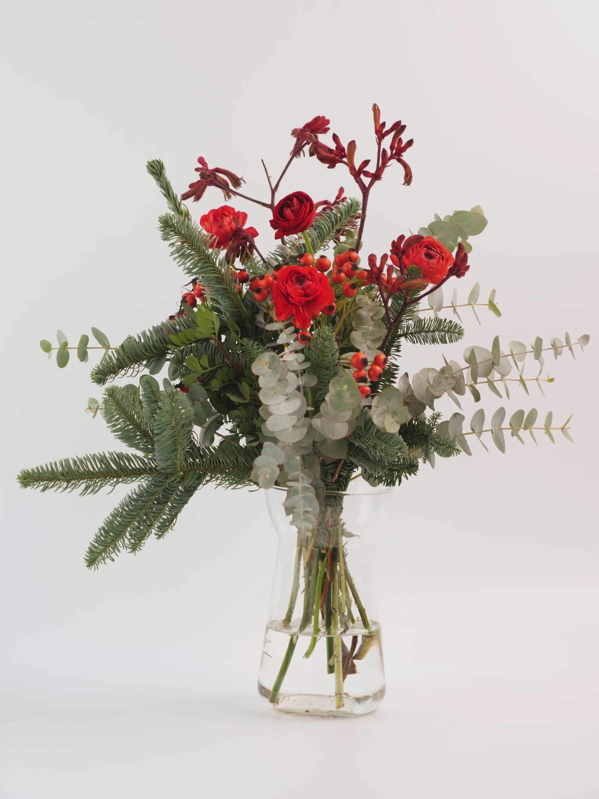 Nos encanta el contraste entre los tonos rojo y granate del ranúnculo y el anigozanthus con el verde del eucalipto y el abeto. Un ramo con personalidad, perfecto para regalar o para decorar cualquier rincón del hogar y darle un toque cálido y especial.