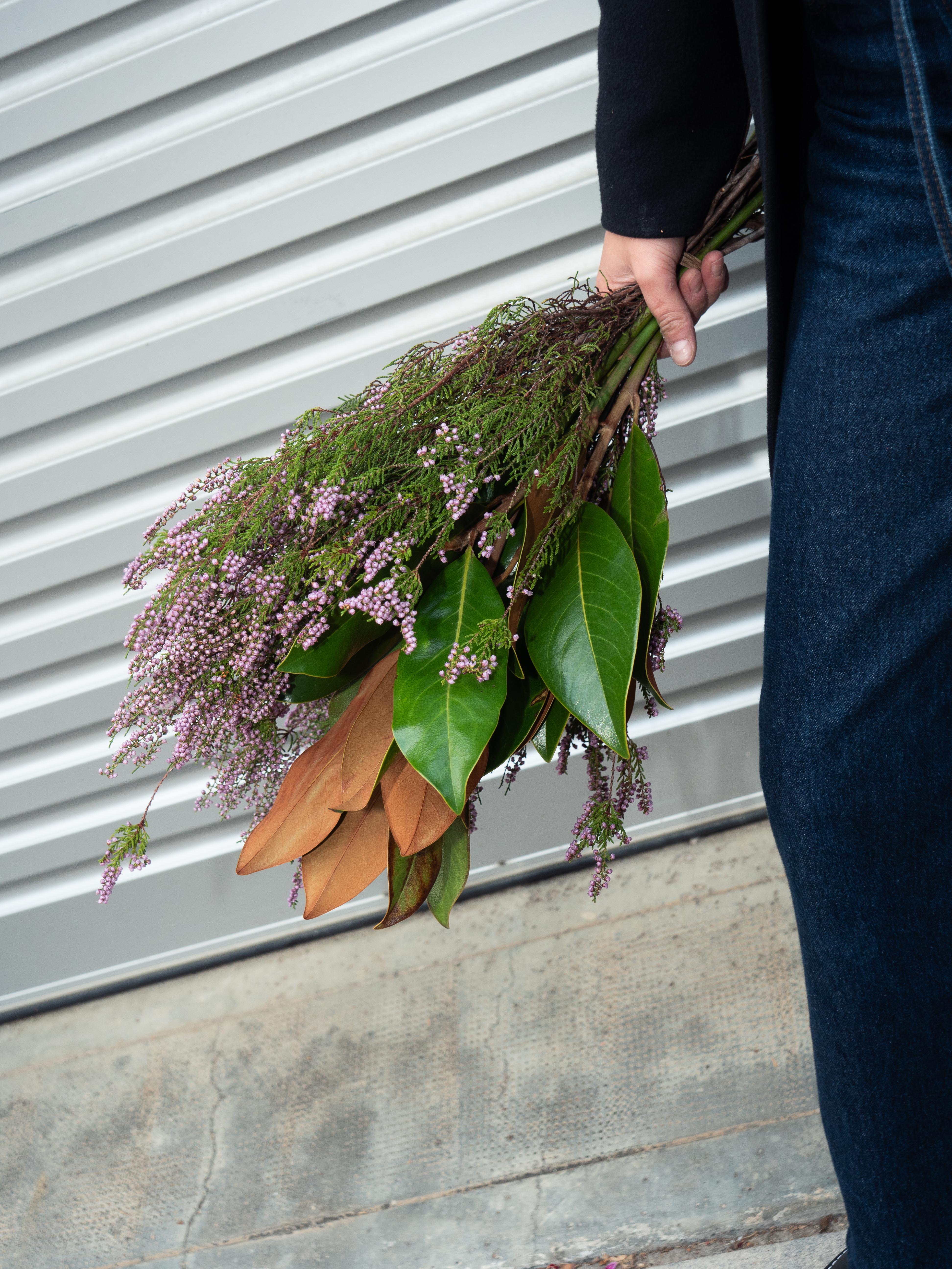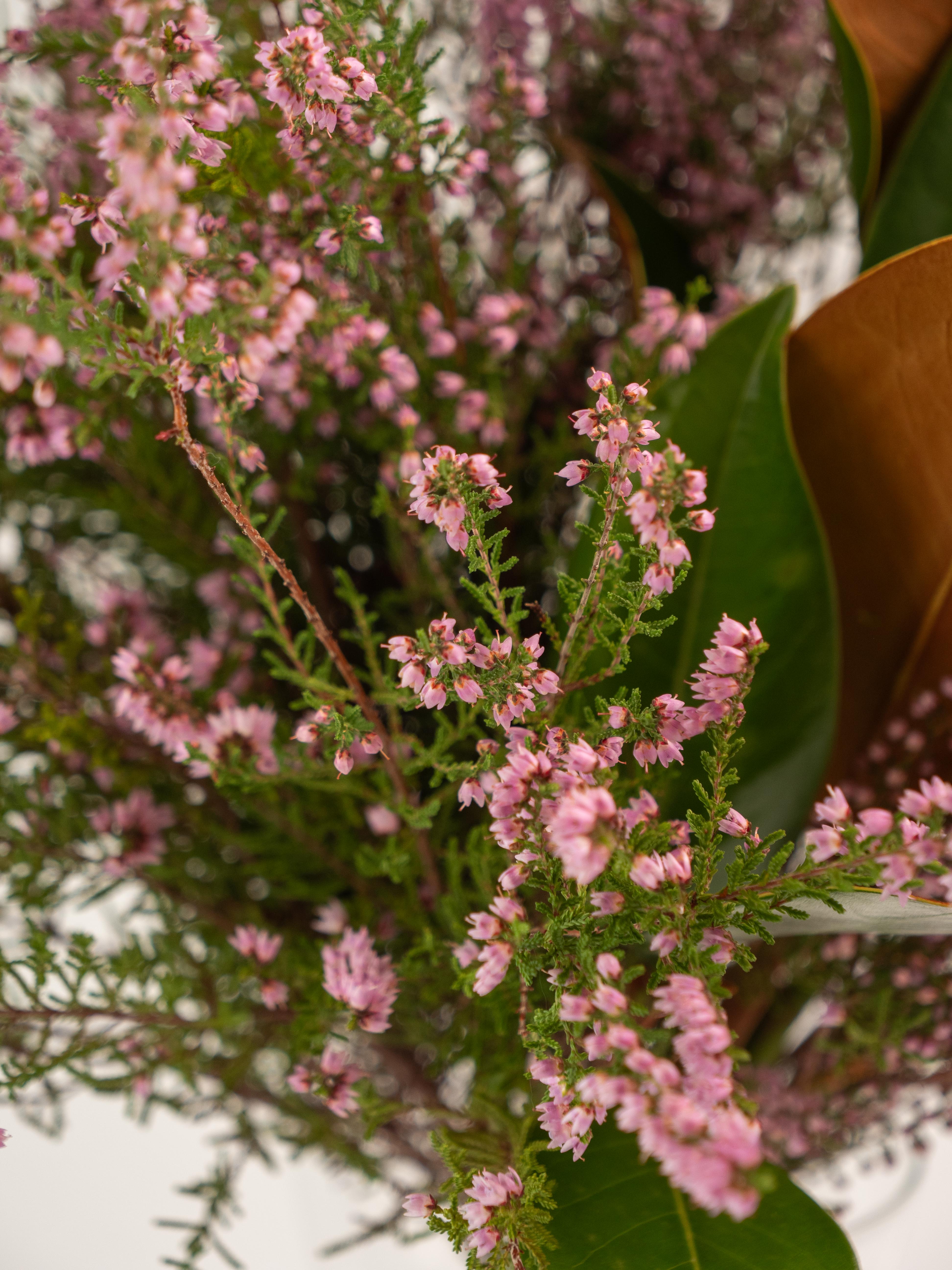 Un ramo delicado y lleno de encanto, donde la suavidad de la Magnolia se combina con la textura y el carácter de la Erica. Ideal para regalar o para aportar un toque natural y sofisticado a cualquier espacio.