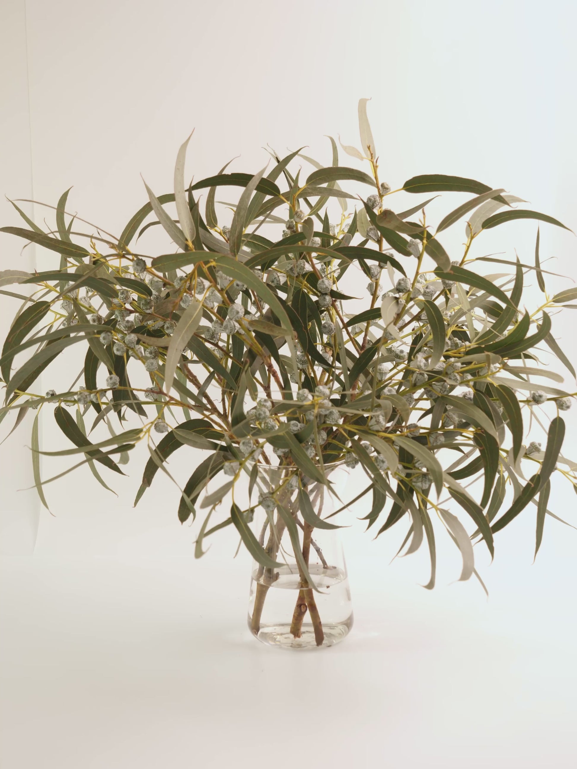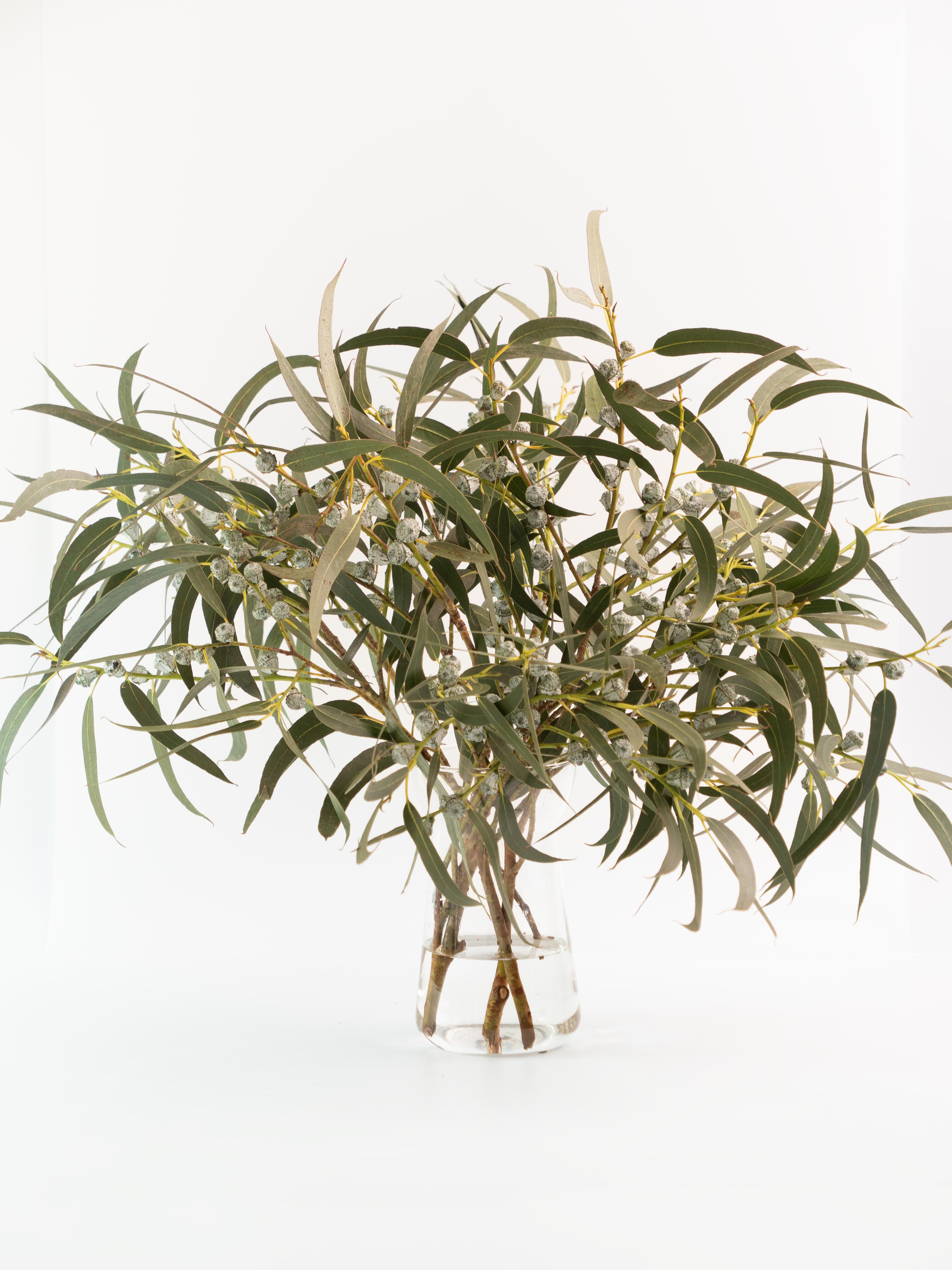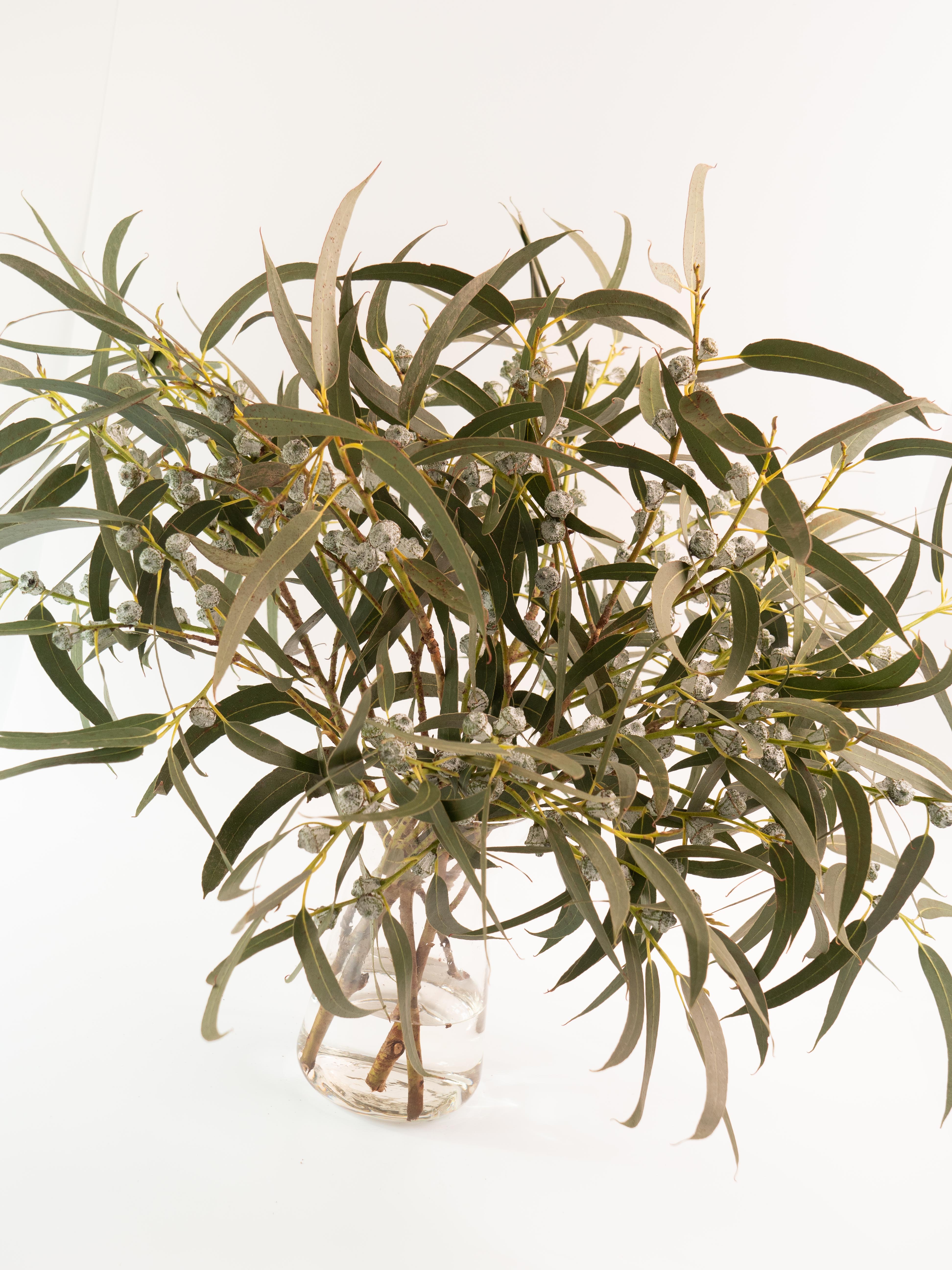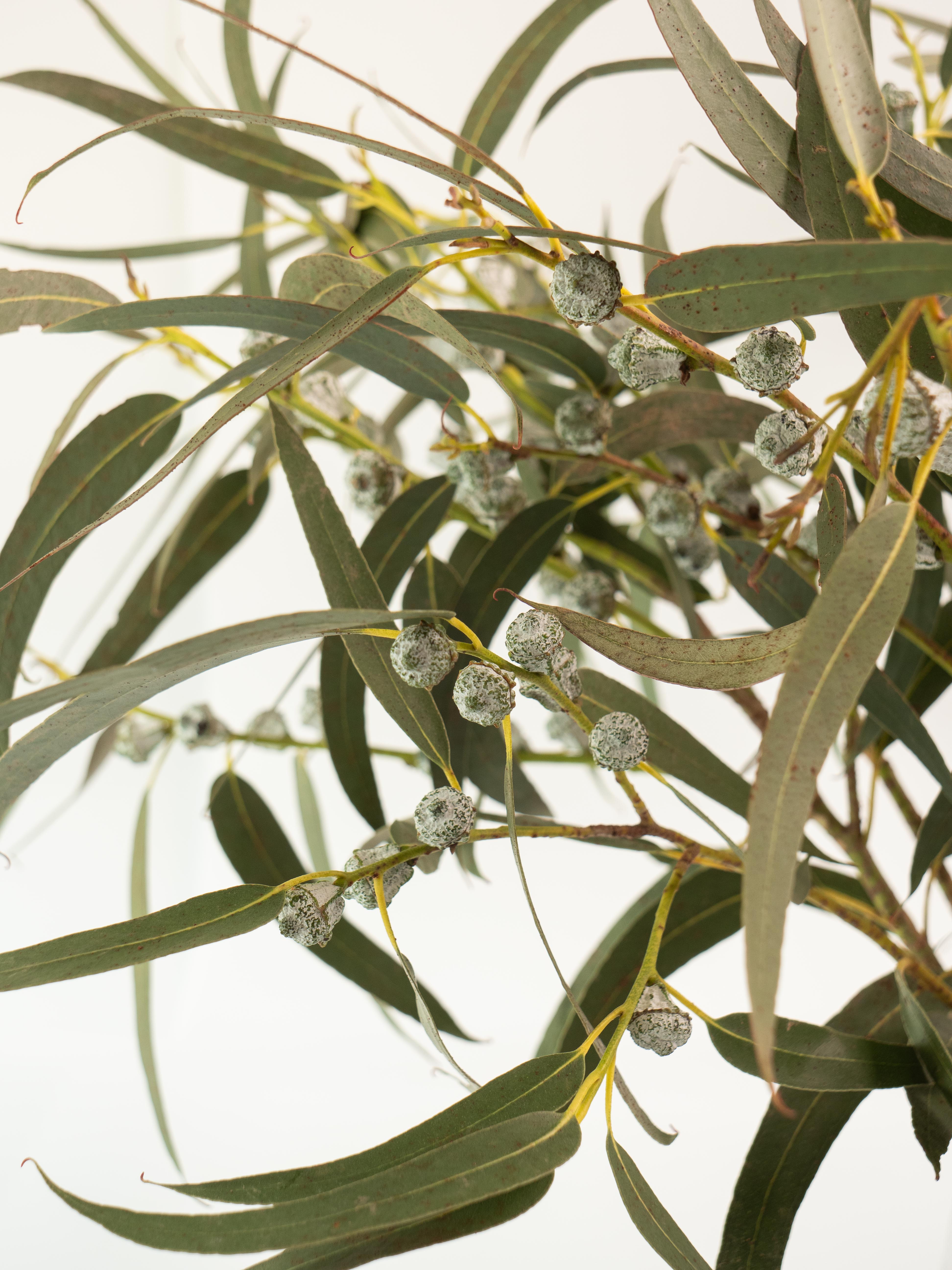 Nos encanta la combinación de la hoja alargada con el fruto redondo tan característico del eucalipto globulus. Es un verde con mucha presencia, voluminoso y capaz de llenar y dar vida a cualquier rincón del hogar.